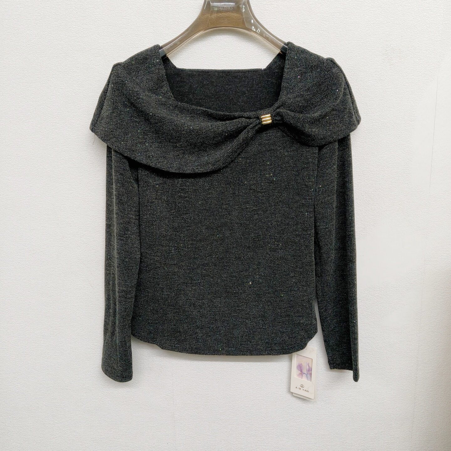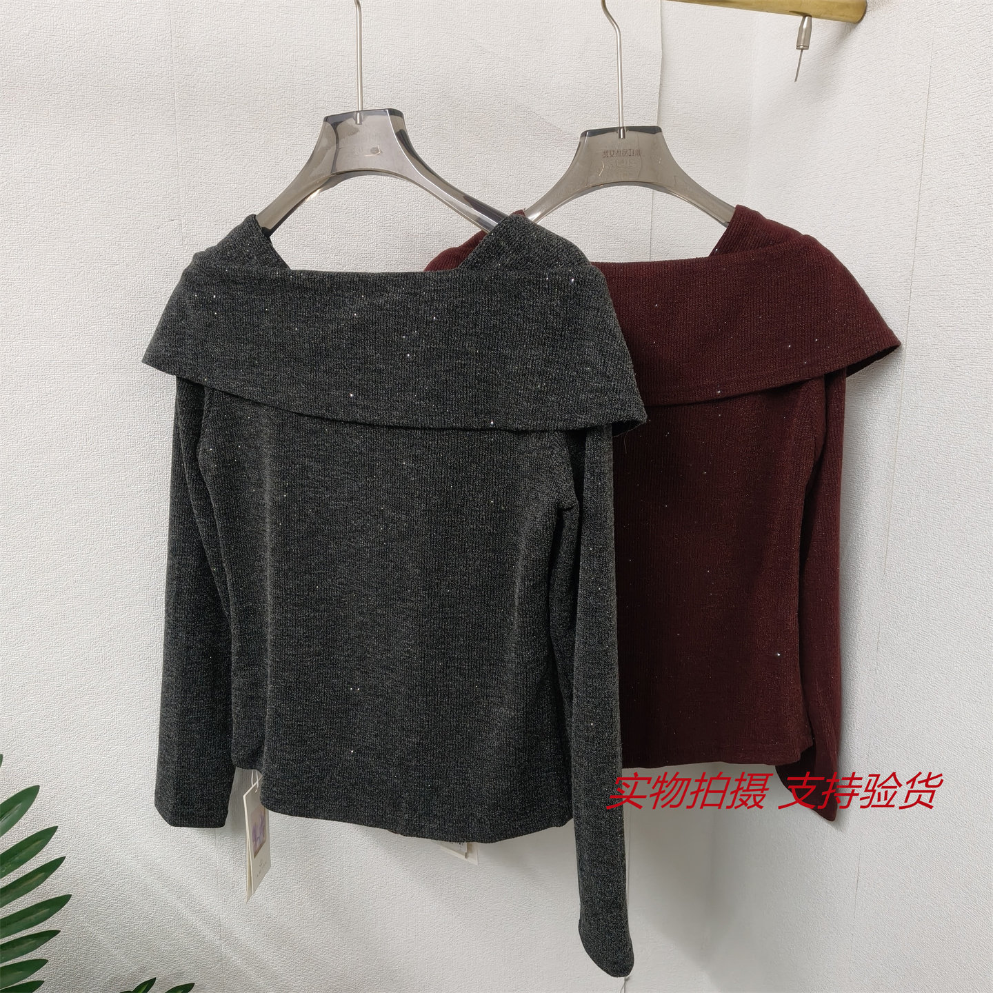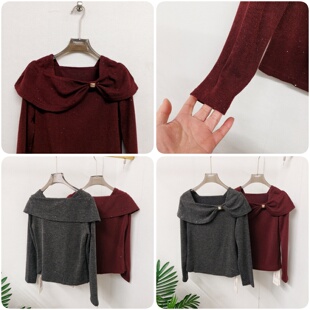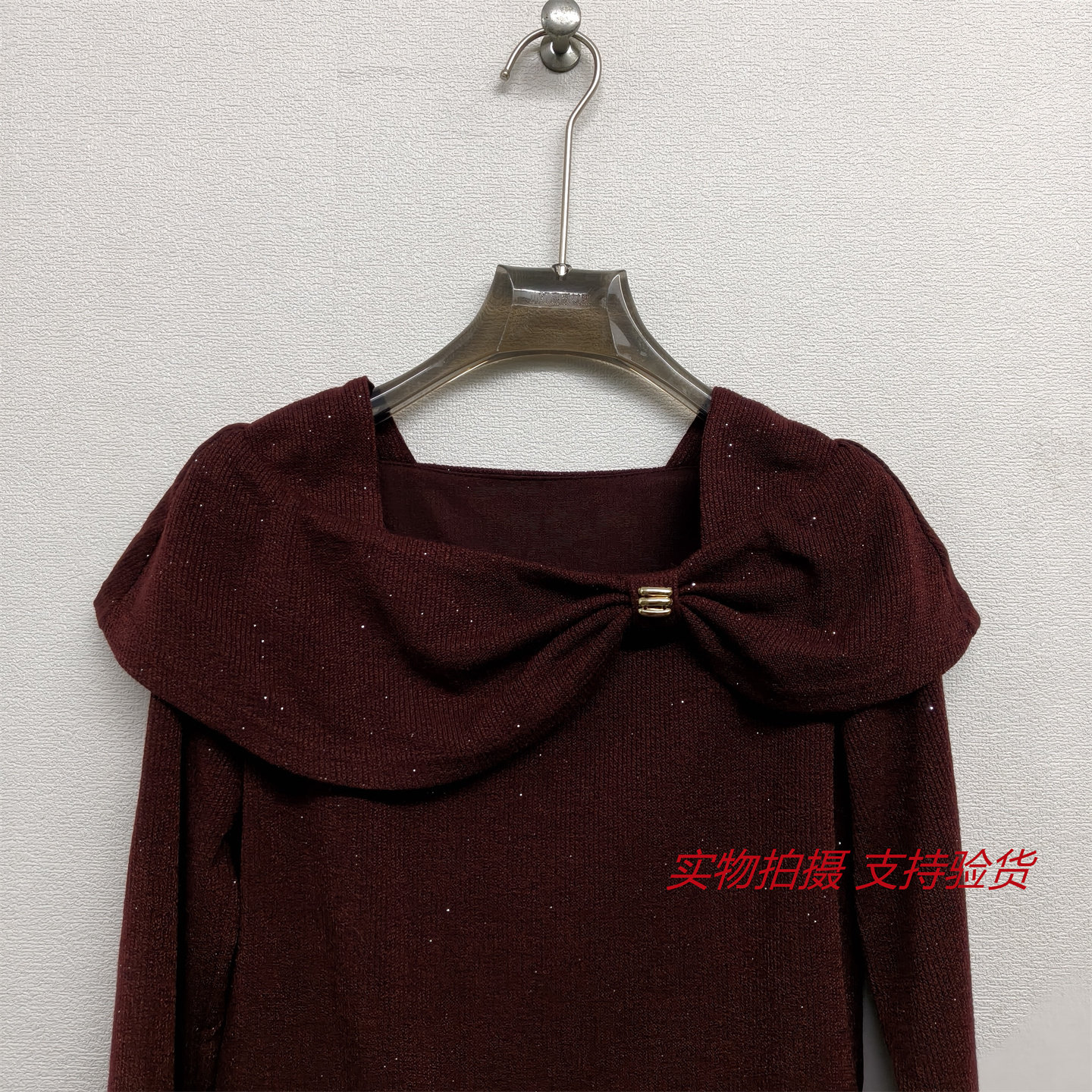 艾2026A01韩味气质一字肩蝴蝶结亮片针织衫 女酒红色减龄百搭上衣