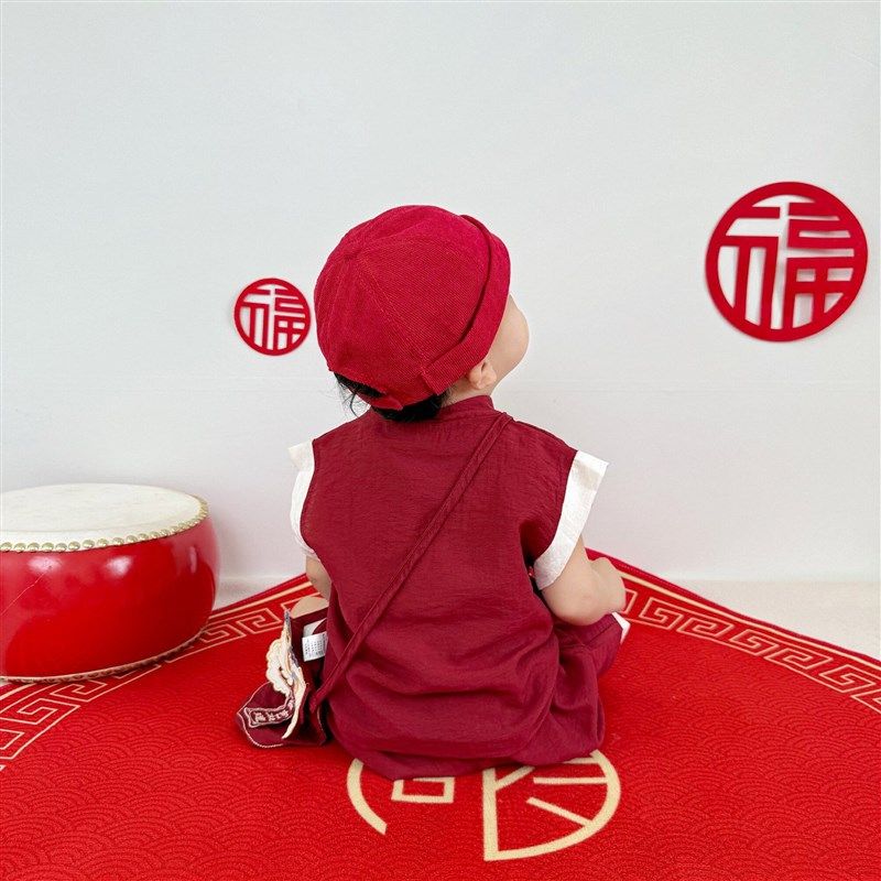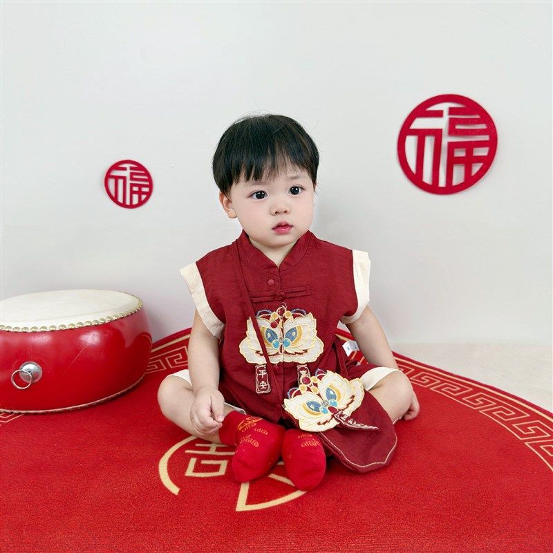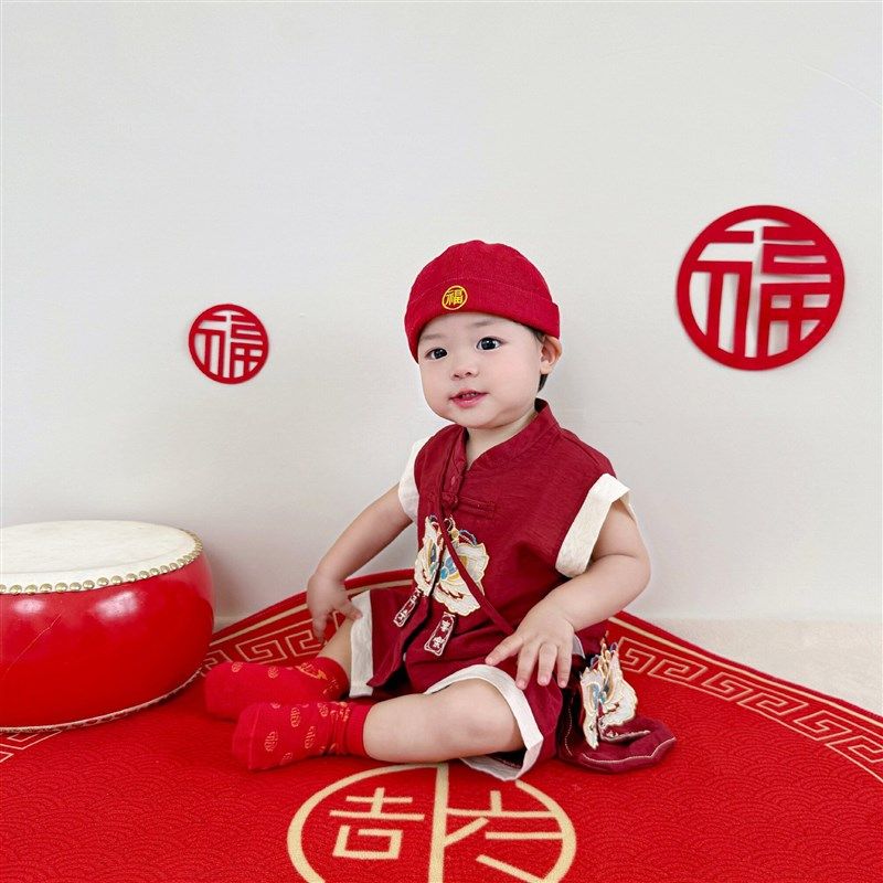 薄款 一周岁礼服男宝新中式 百天生日套装 满月短袖 婴儿抓周儿童唐装