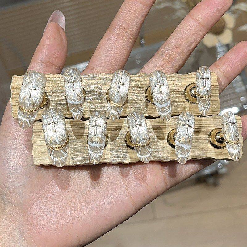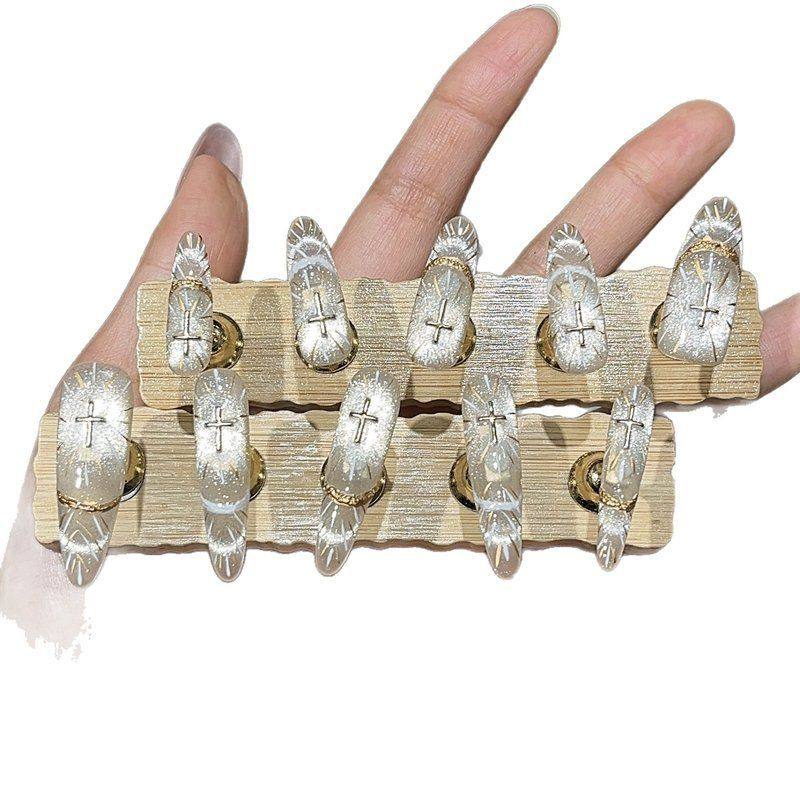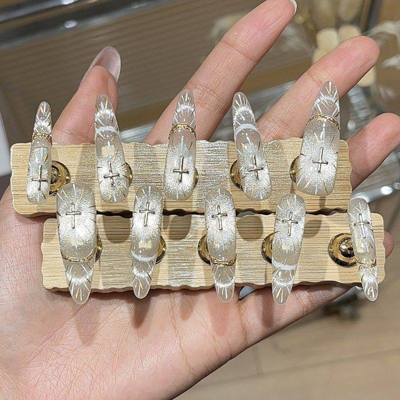 纯手工金色圣光氛围感爆闪极光猫眼手绘线条法式 高级细狗尖穿戴甲