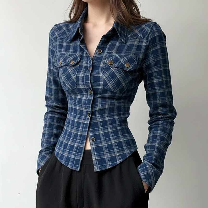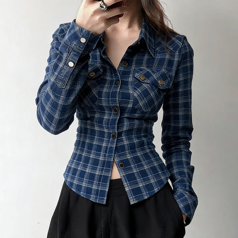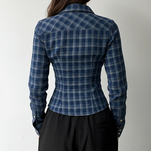 女日杂格调修身 ROCKMORE 衬衫 复古格纹翻领长袖 上衣 酷辣高智感