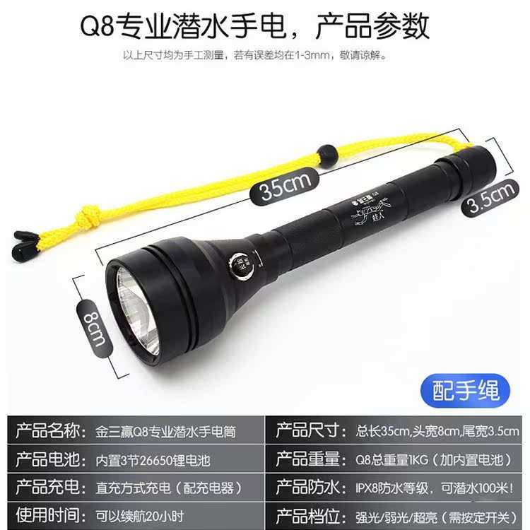 金三赢Q8潜水手电筒p70亮户外水底防水LED充电水下照明