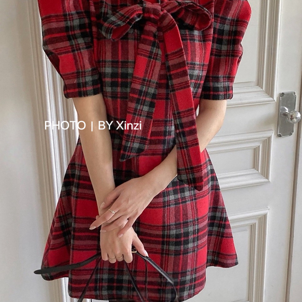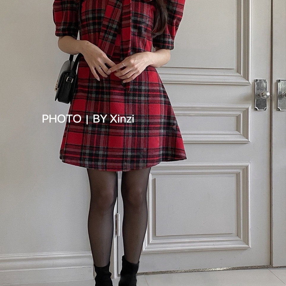 收腰修身 子连衣裙女泡泡袖 显瘦减龄短裙 复古红港风格 辛子韩国代购