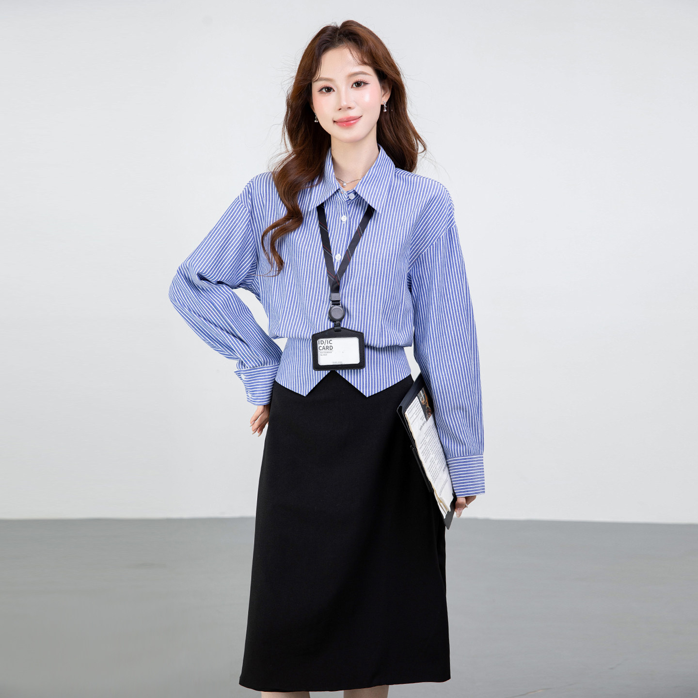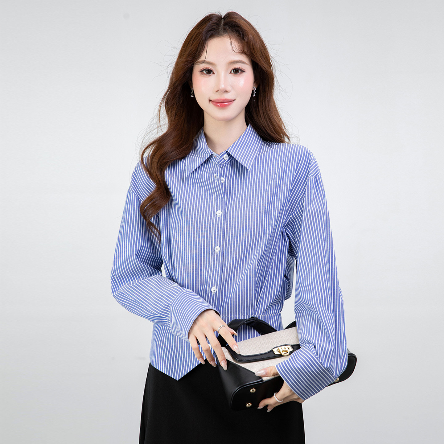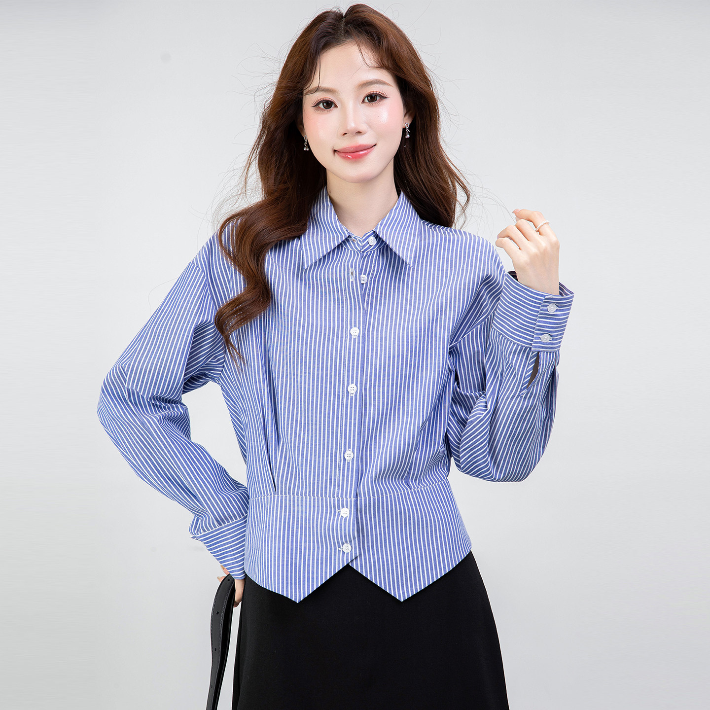 蓝色条纹收腰高腰衬衫 立体剪裁显瘦通勤职场穿搭