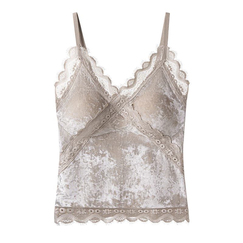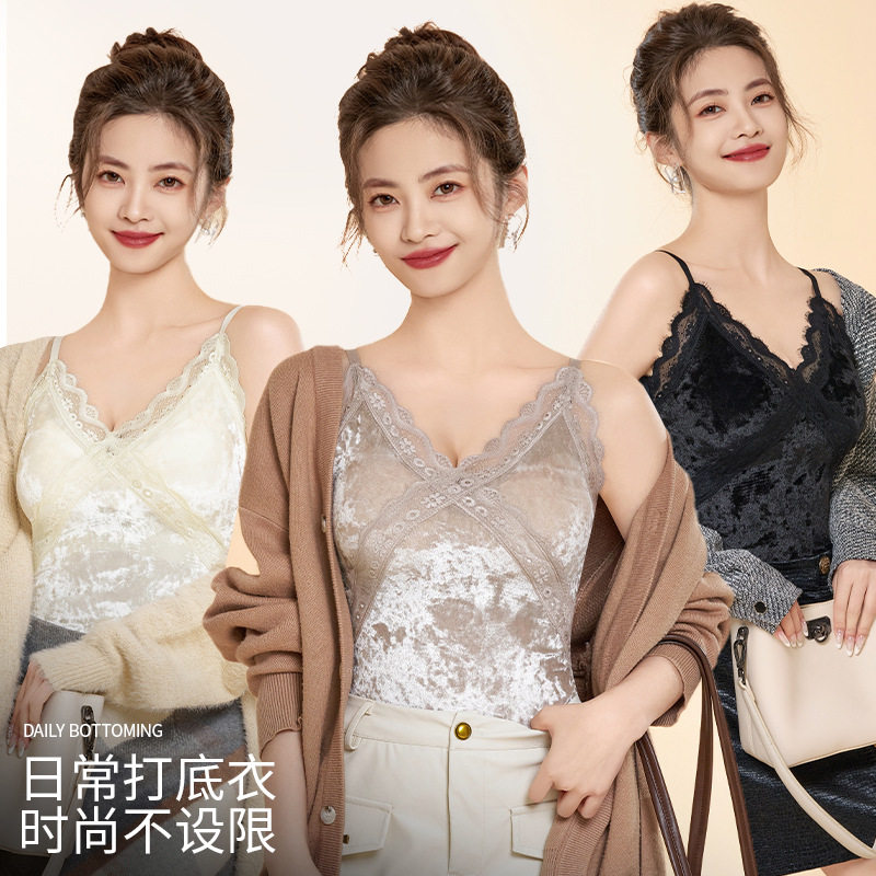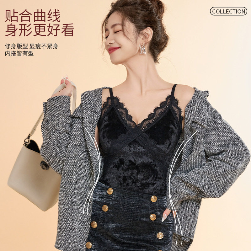 保暖背心女法式 金钻蕾丝无痕水晶绒吊带固定杯罩聚拢V领美背打底