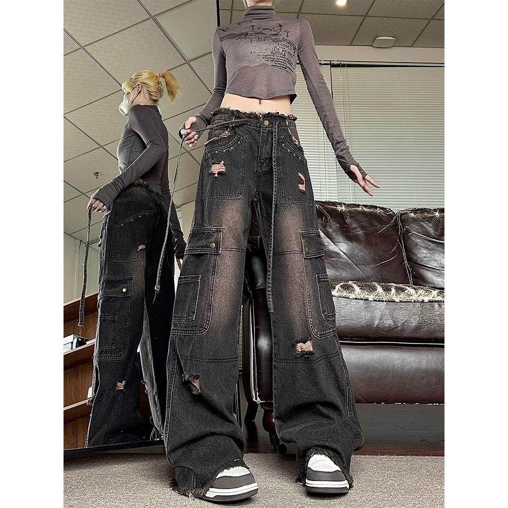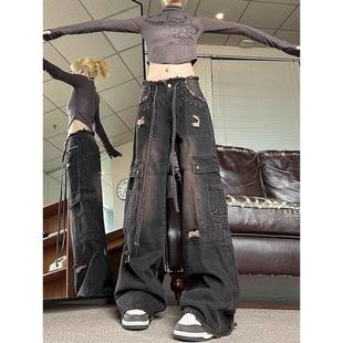 高街复古高腰宽松直筒阔腿韩版 美式 女百搭新款 毛边黑粉潮流牛仔裤
