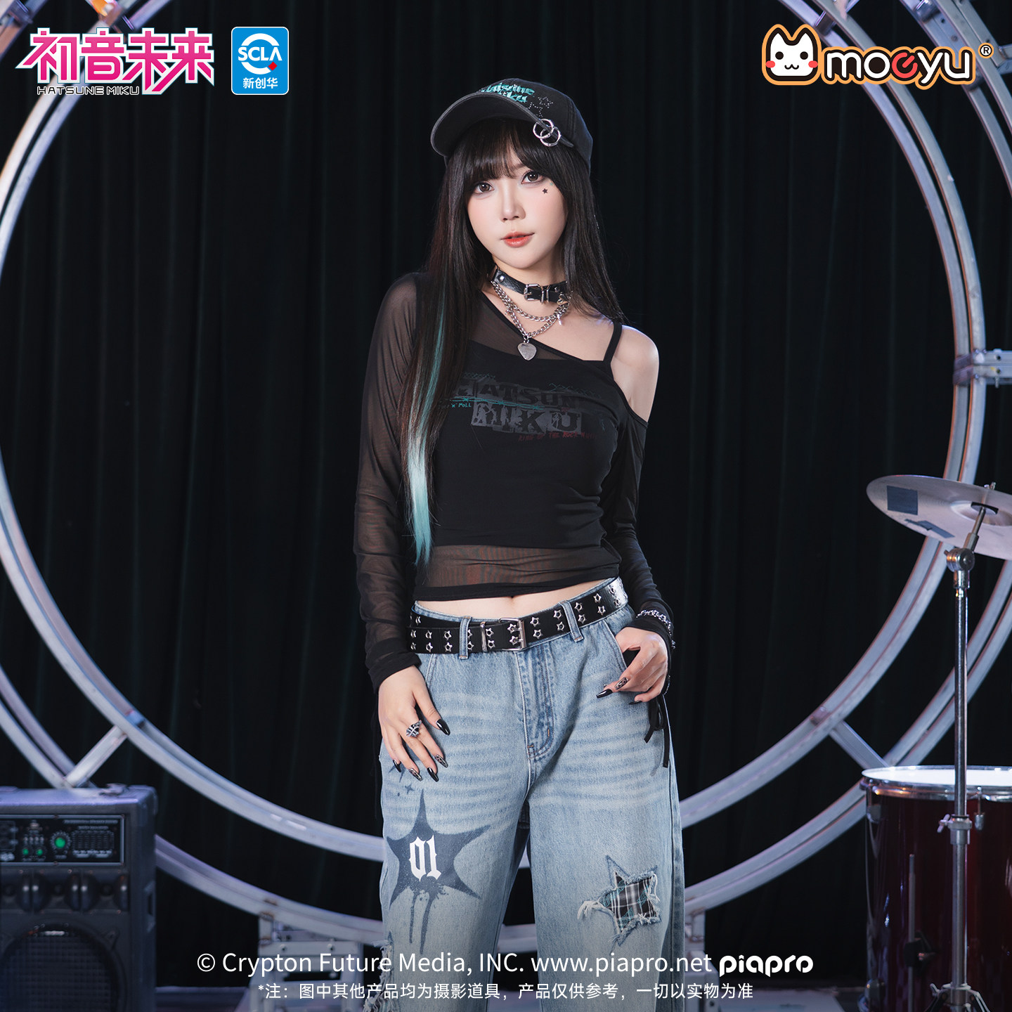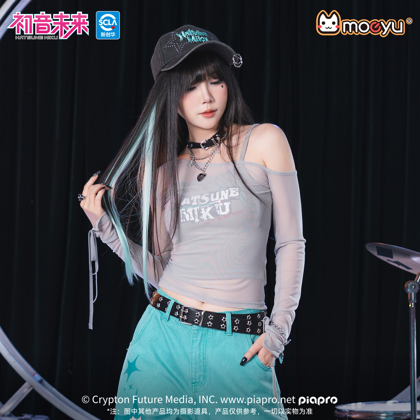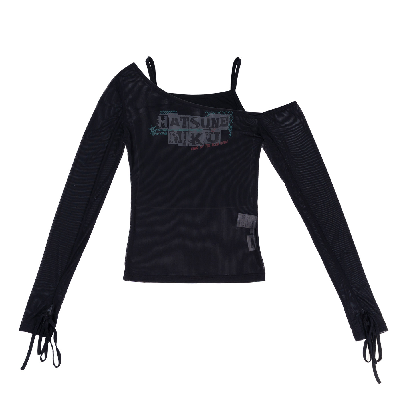 moeyu初音未来摇滚未来斜肩网纱长袖 t恤女假两件甜辣吊带露肩上衣