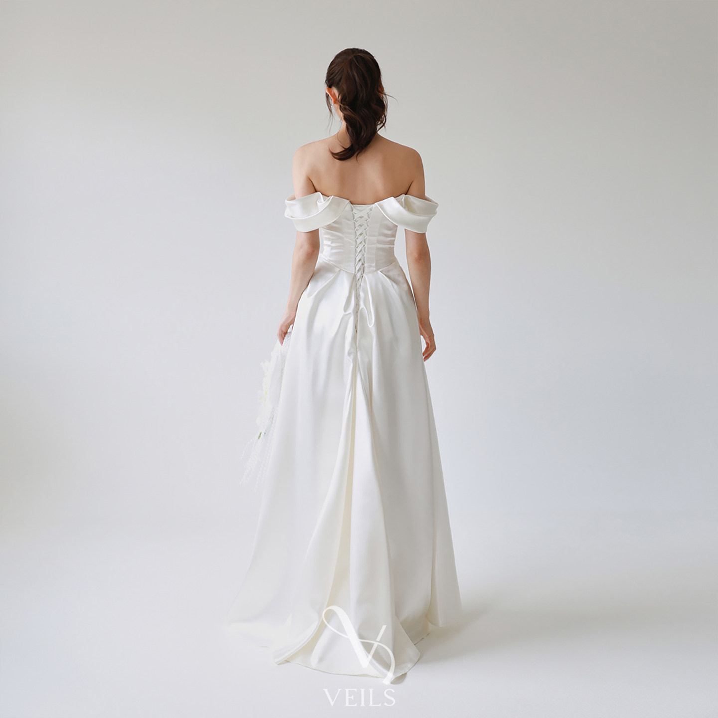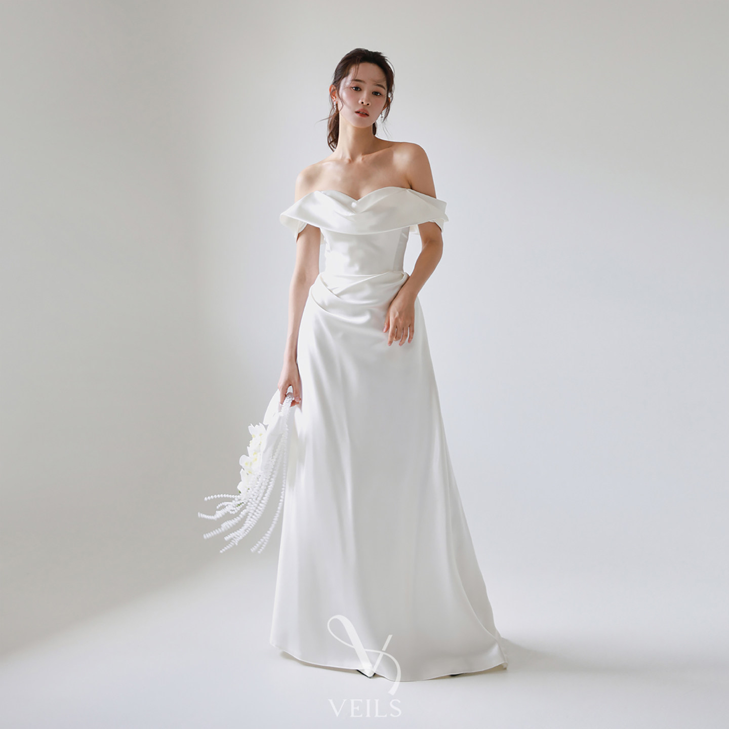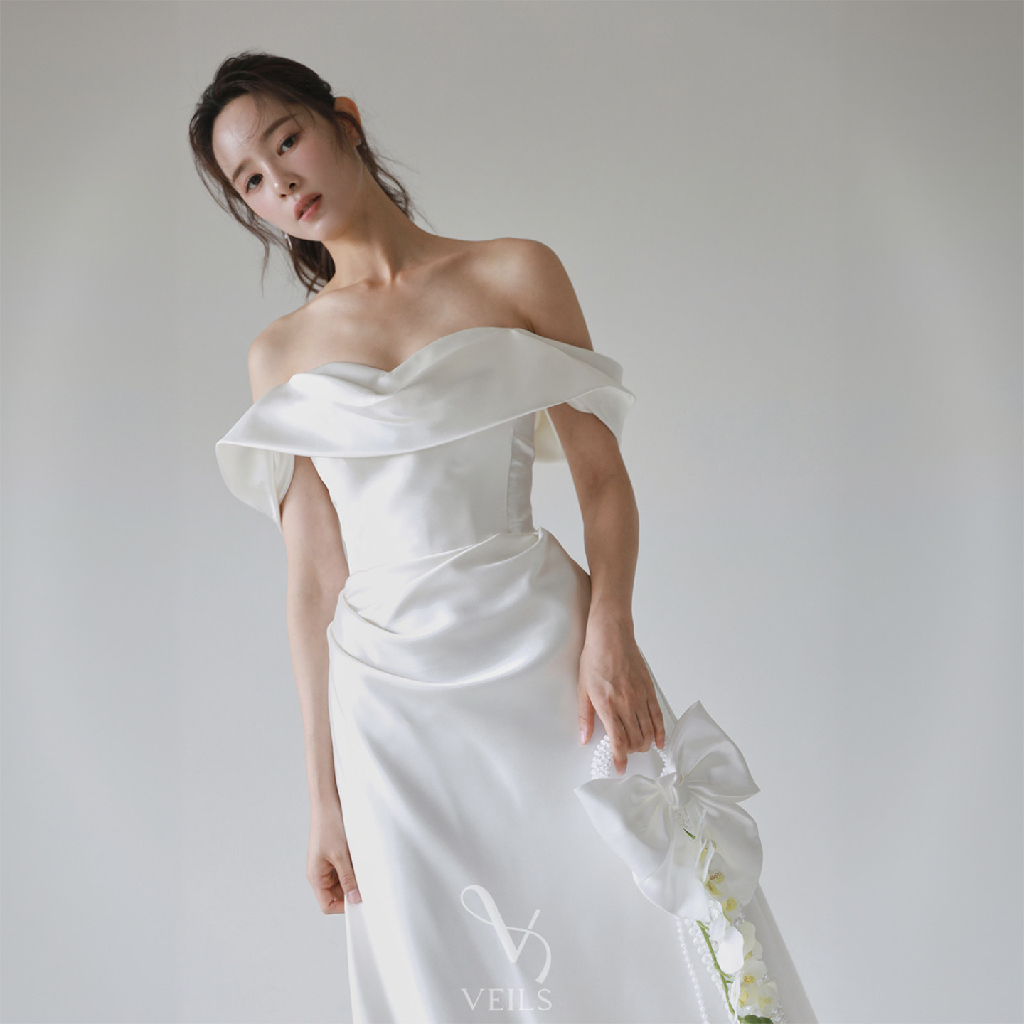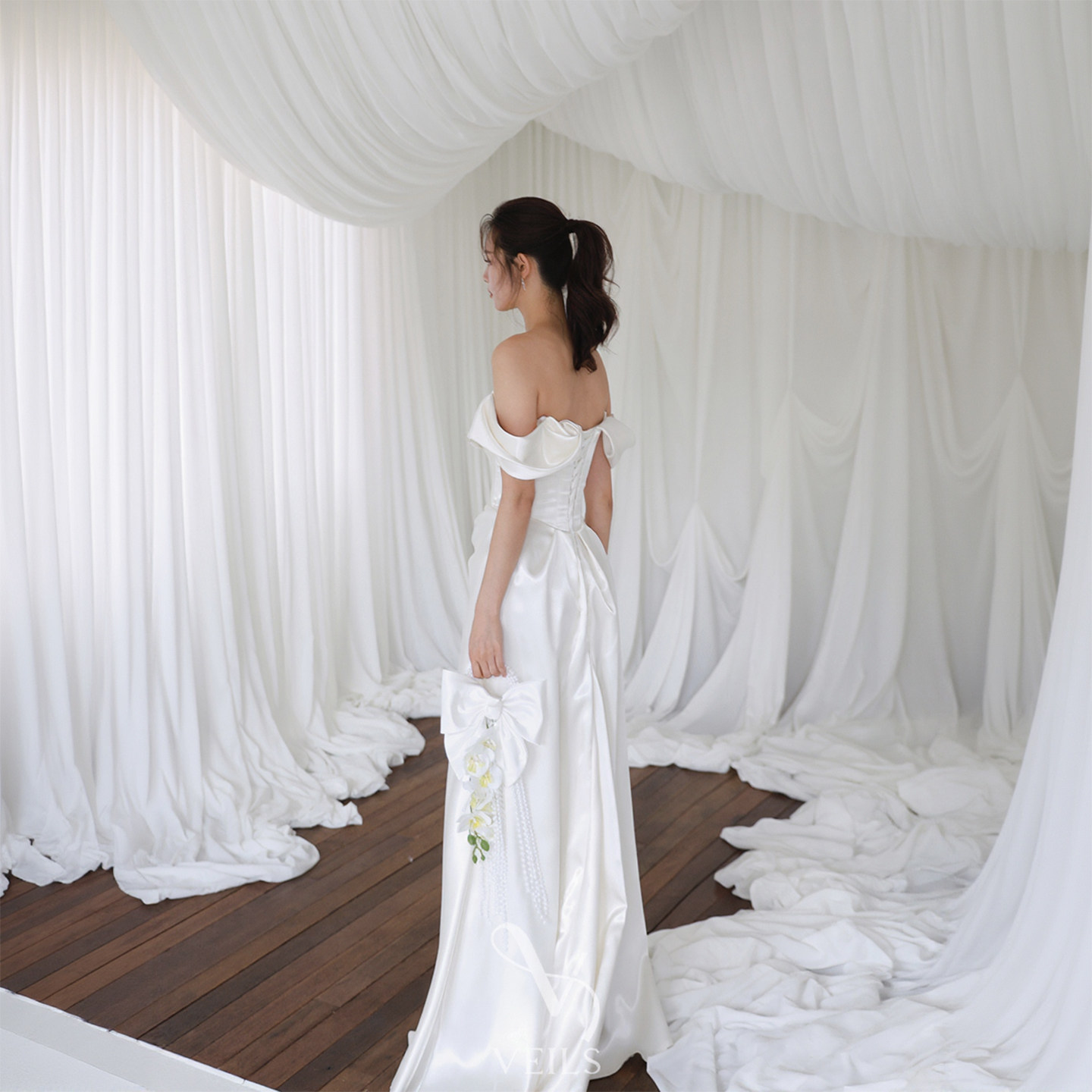 Veils简约显瘦法式 一字肩抓褶轻婚纱缎面气质新娘白色鱼尾礼服