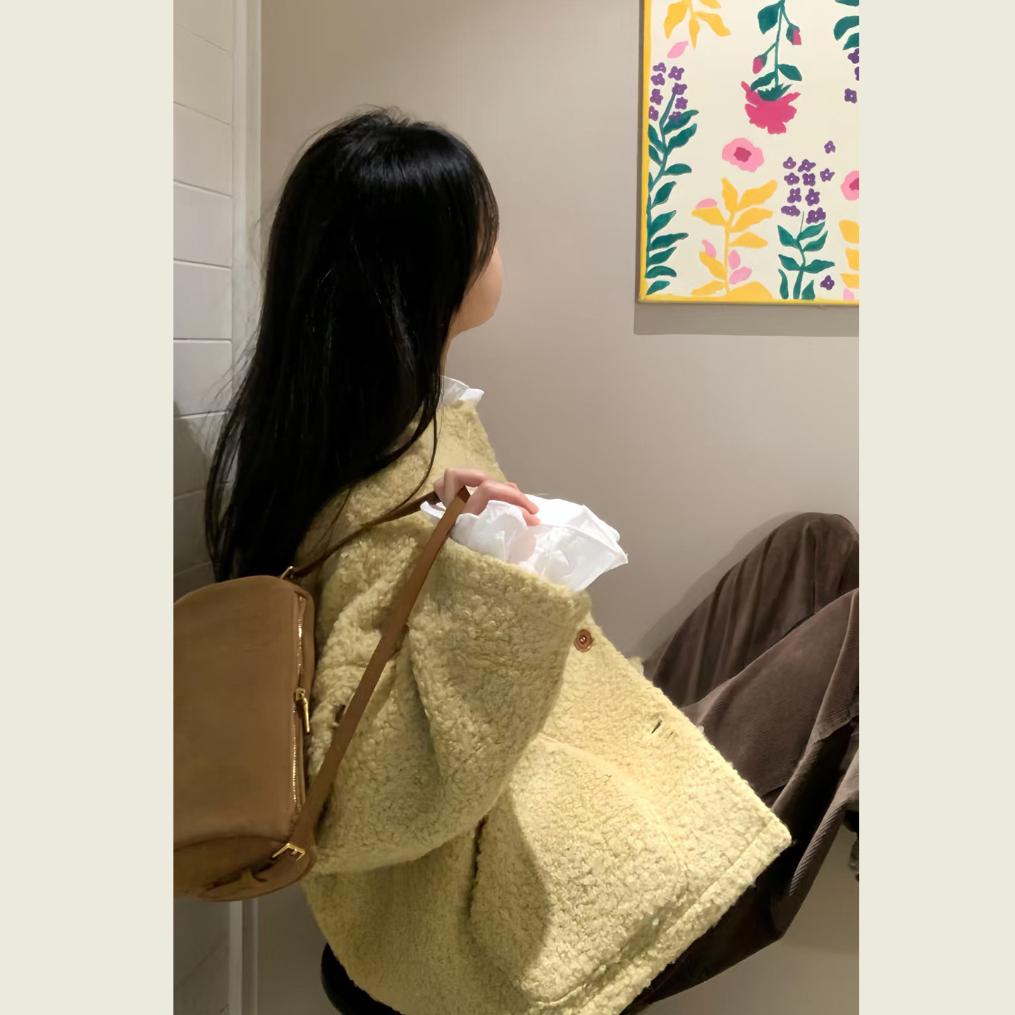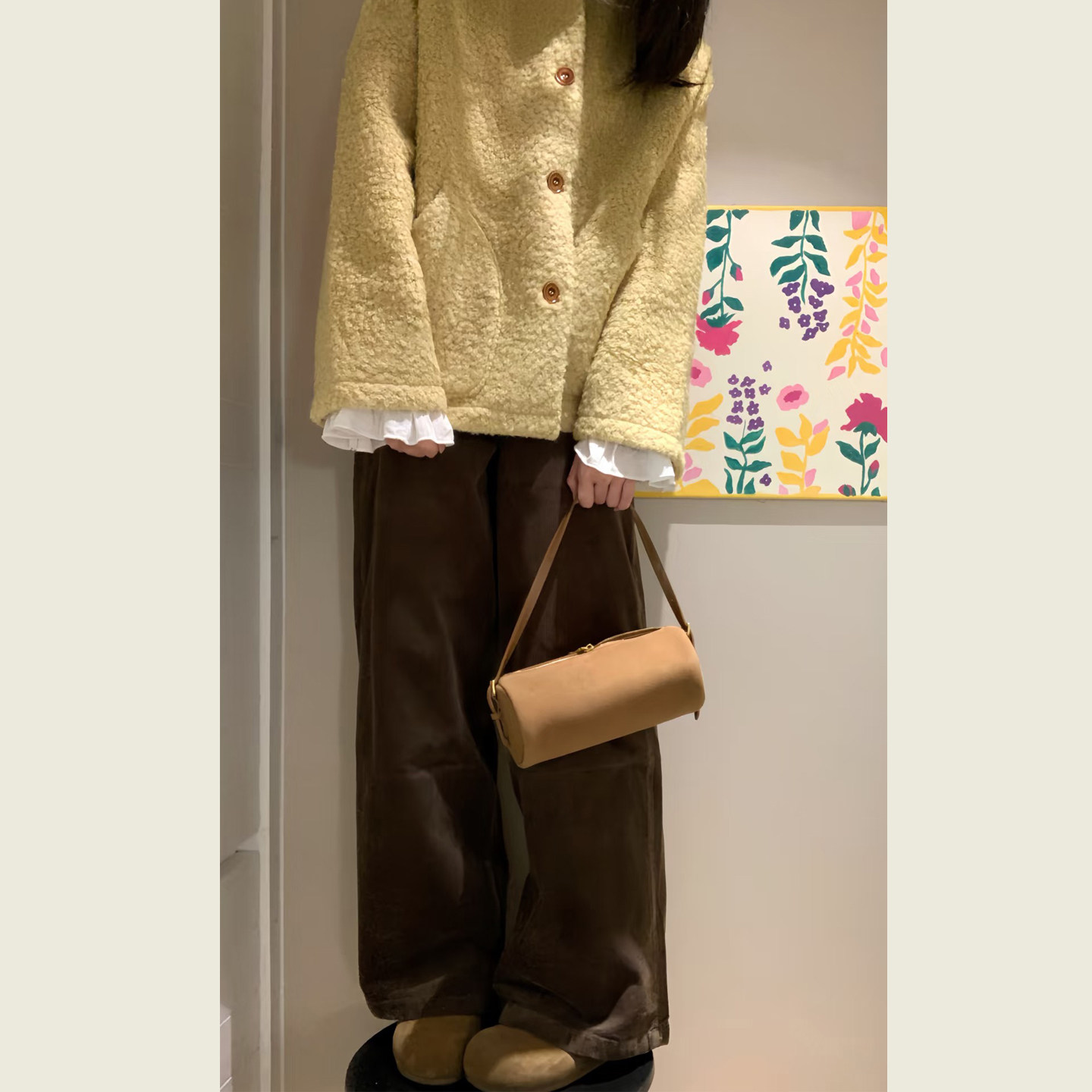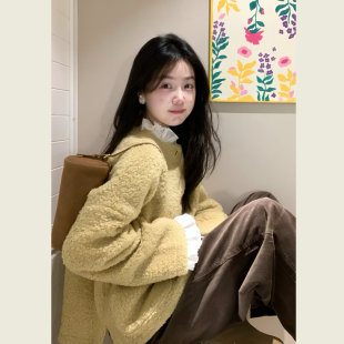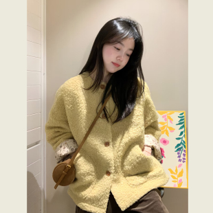 复古黄碎花拼接长袖 小个子宽松休闲圈圈毛呢大衣 毛呢外套女冬季