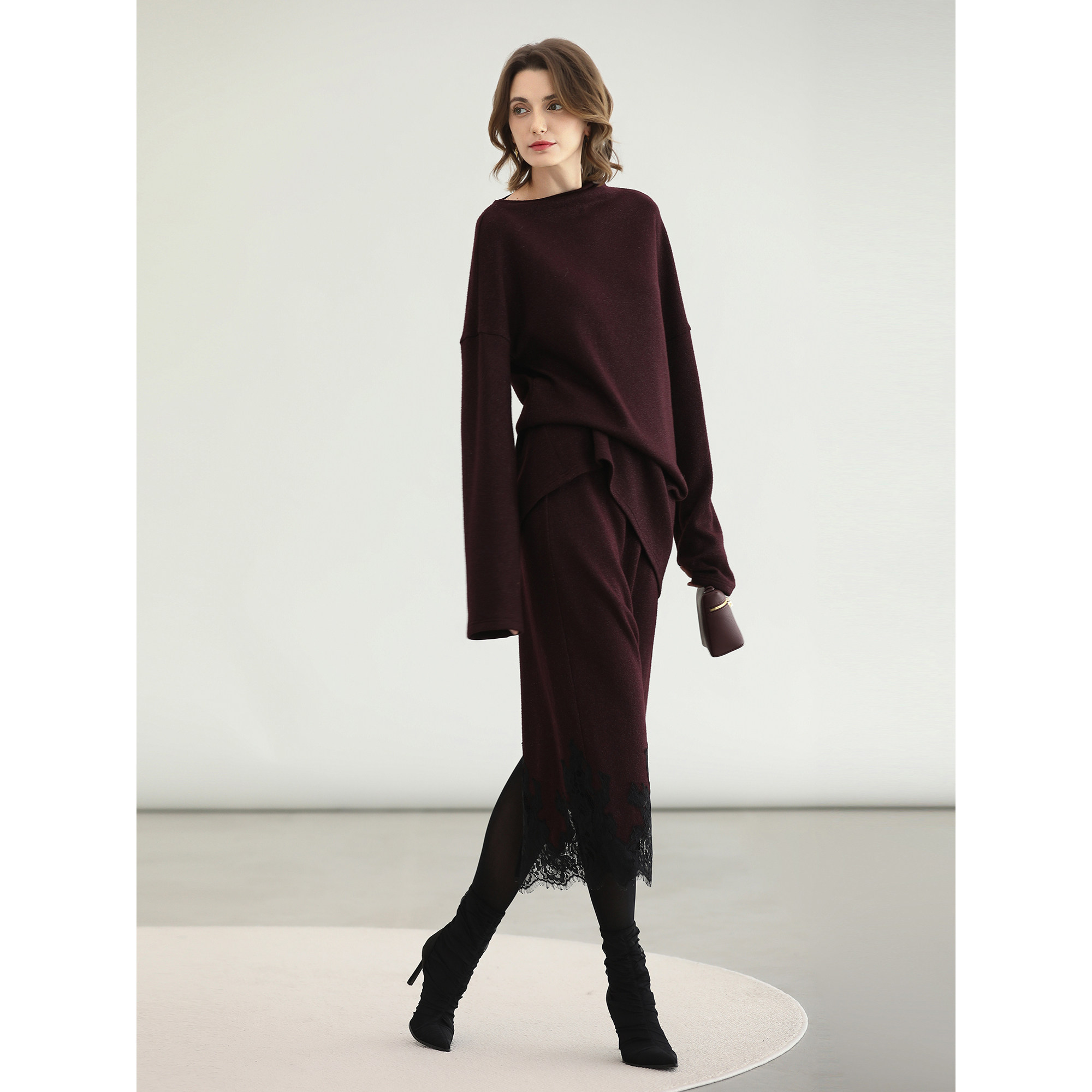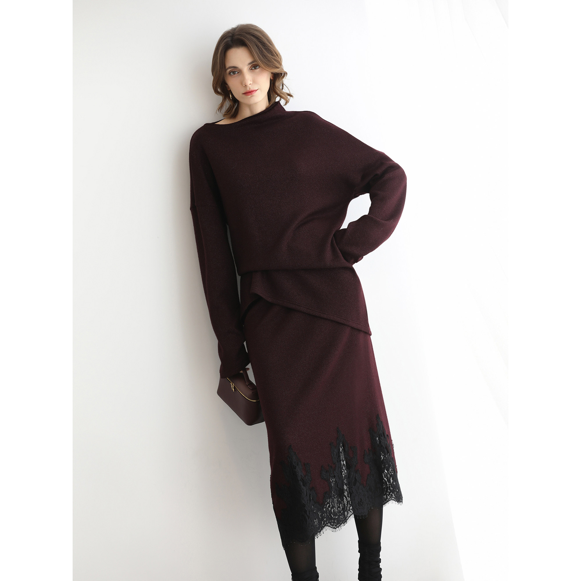 COCOBELLA女人味蕾丝拼接半身裙秋冬直筒针织女中长裙HS3113