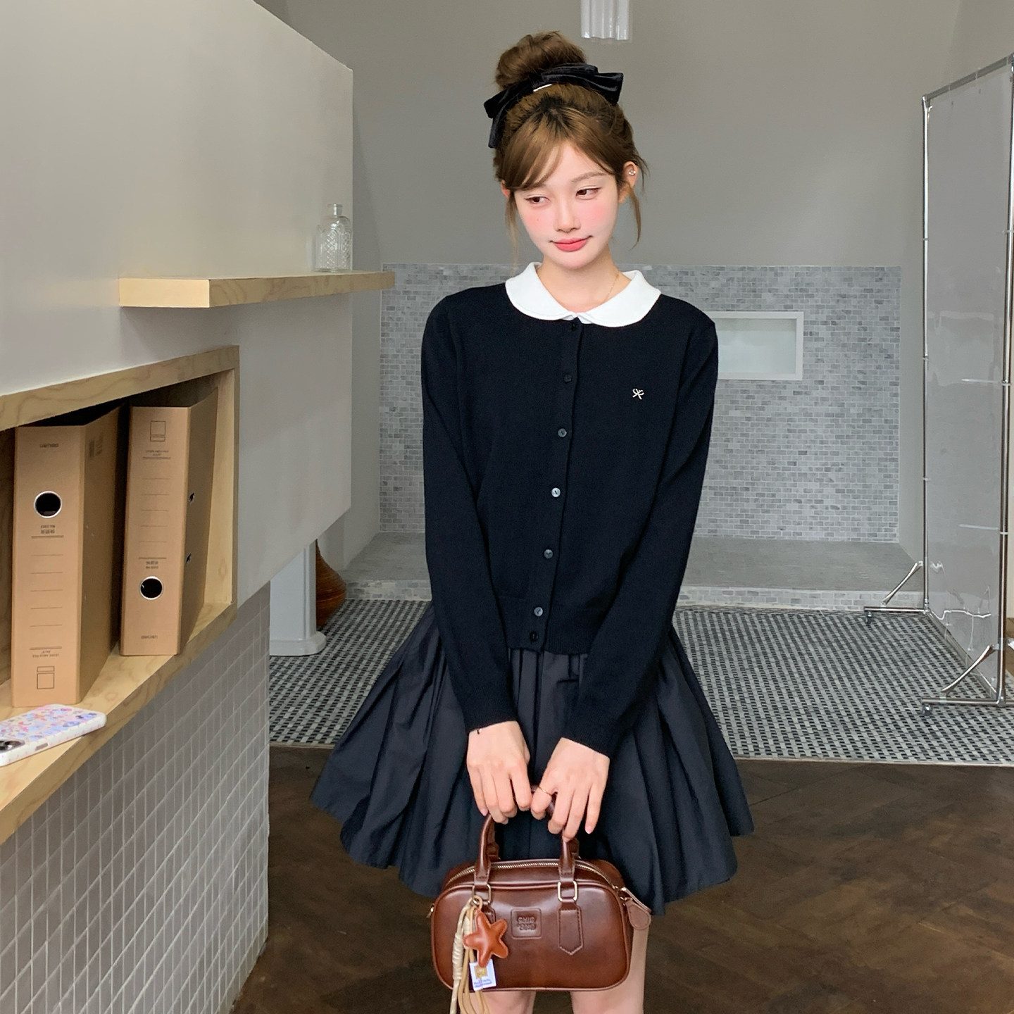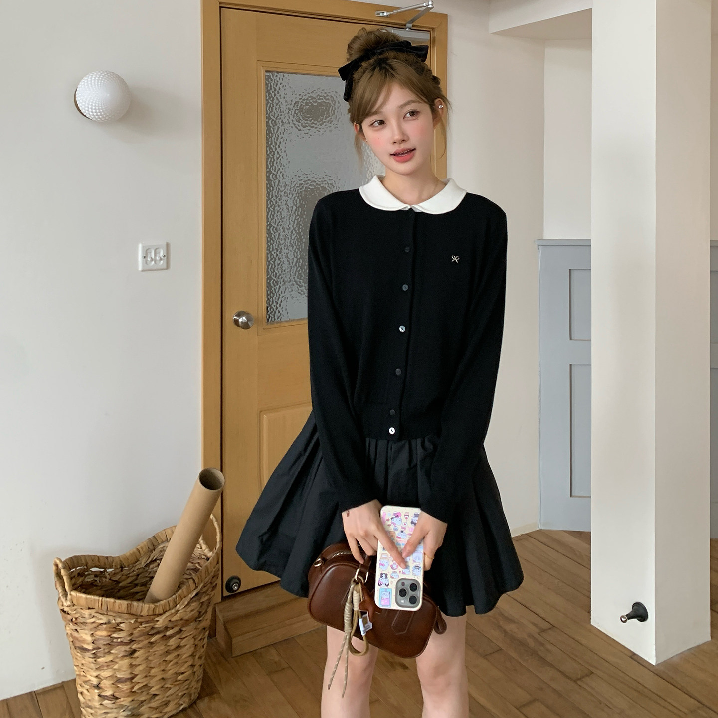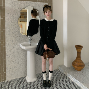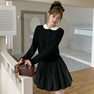 东京岁时记jk黑色单排扣毛衣开衫 女秋外套 撞色娃娃领小个子针织衫