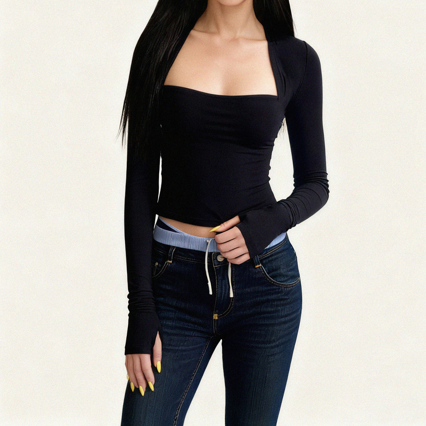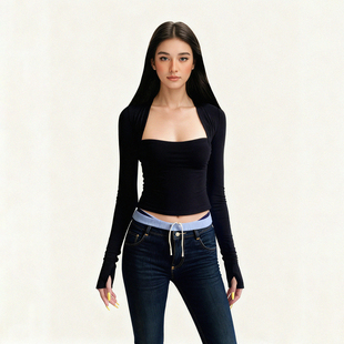 T恤2025秋收腰内搭上衣女 简约黑色包肩方领假两件长袖 FUNOFF 美式