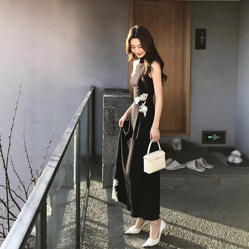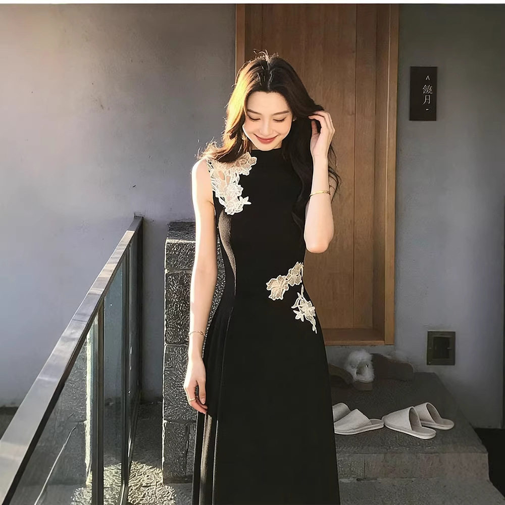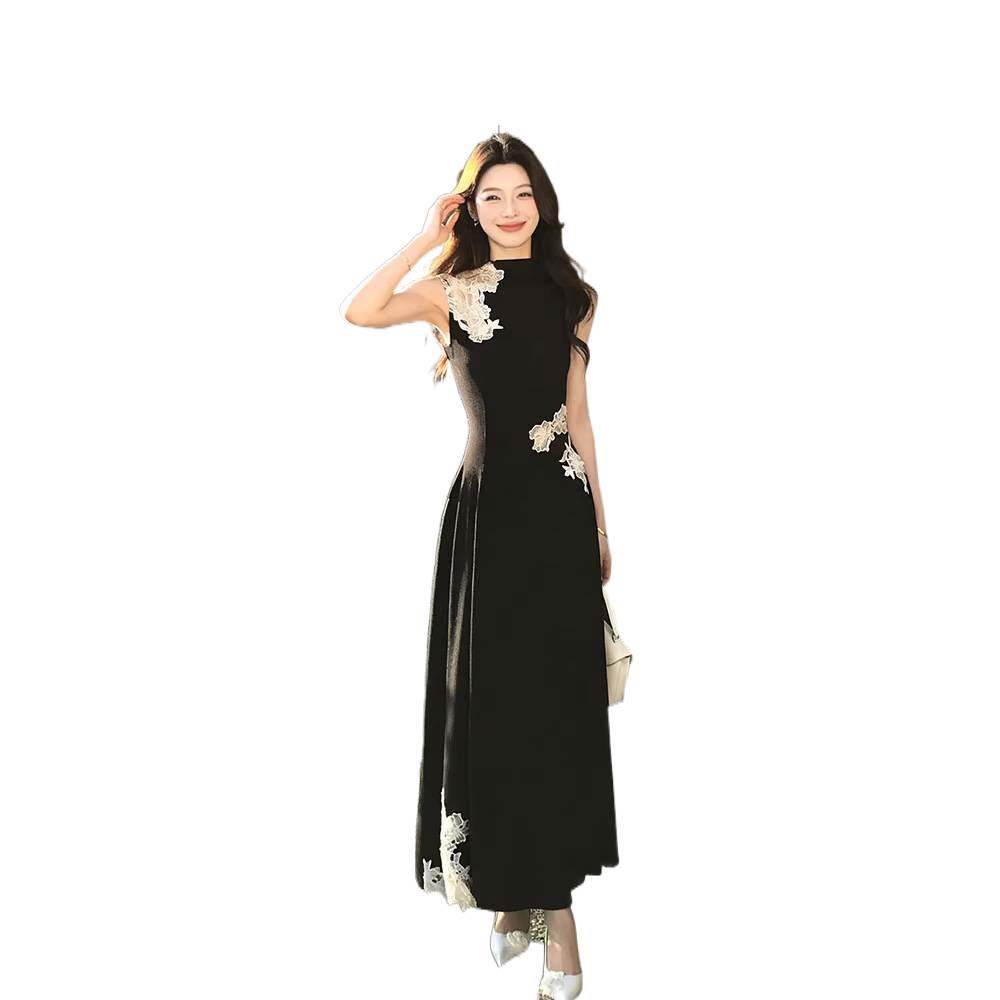 立领无袖 新中式 蕾丝刺绣针织连衣裙垂感高腰A字长裙 新款 2026夏季