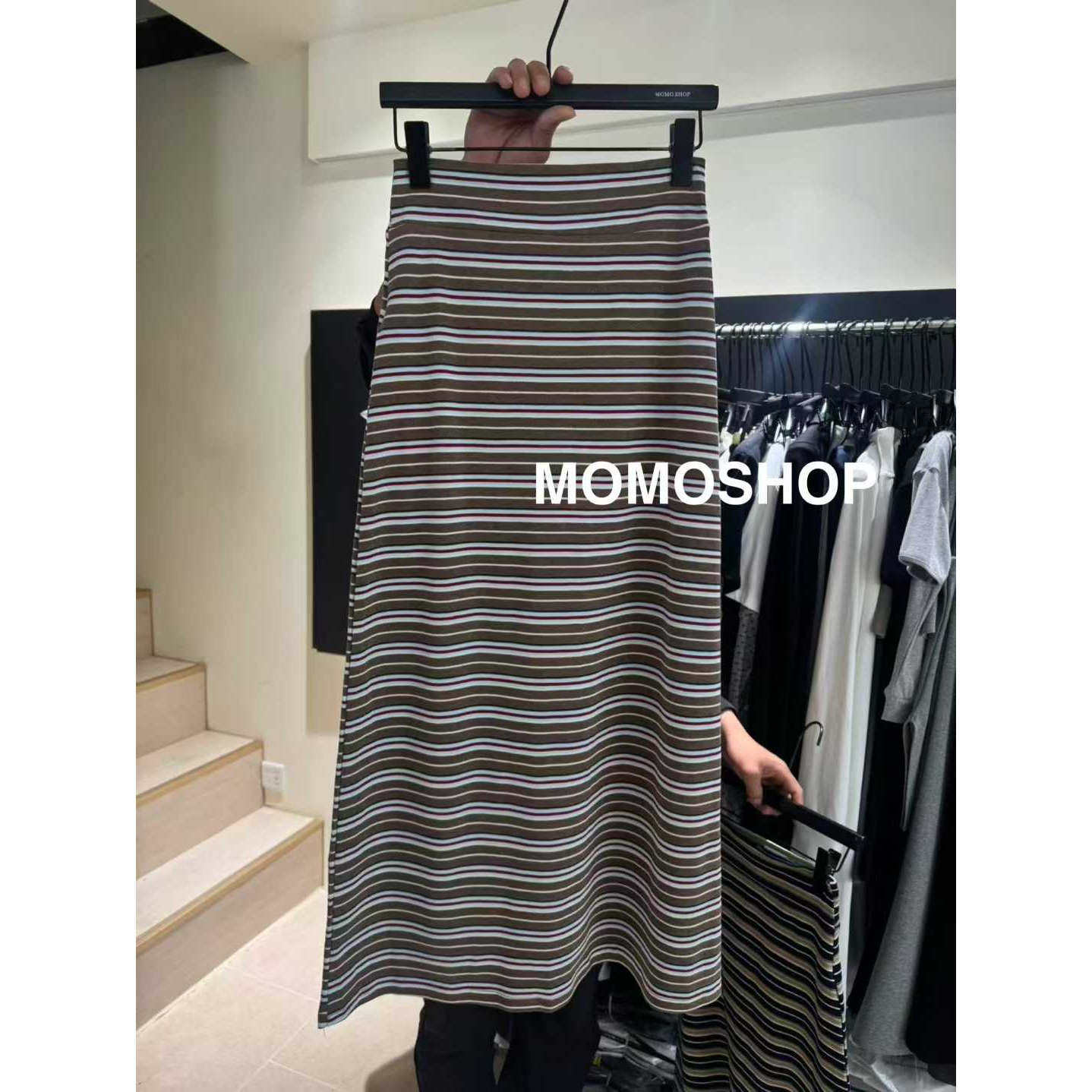 MOMO春季 条纹半身裙女时髦气质百搭显瘦高腰过膝休闲长裙 2026新款