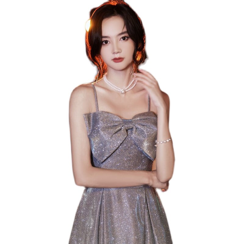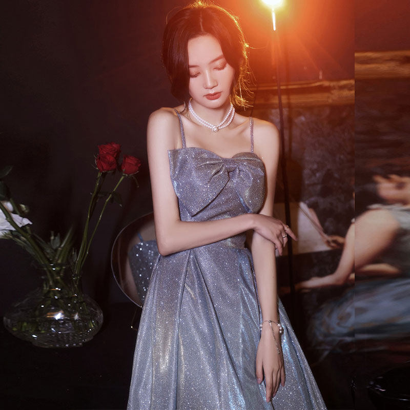 亮片一字肩主持人合唱指挥礼服女 蓝色长款 星空晚礼服2022新款 夏季