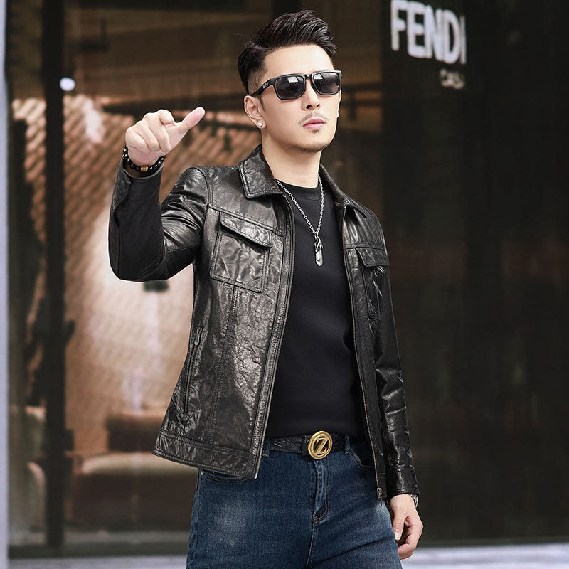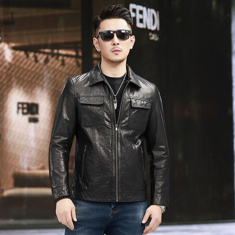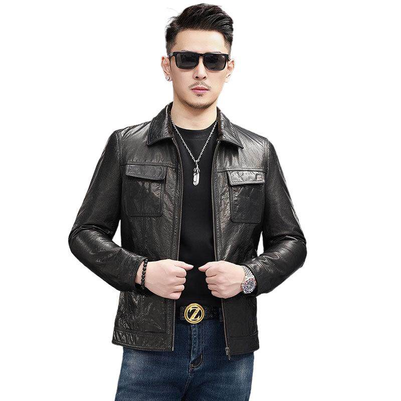 海宁皮衣翻领男士 薄外套 机车休闲皮夹克真皮潮流春秋多口袋单装