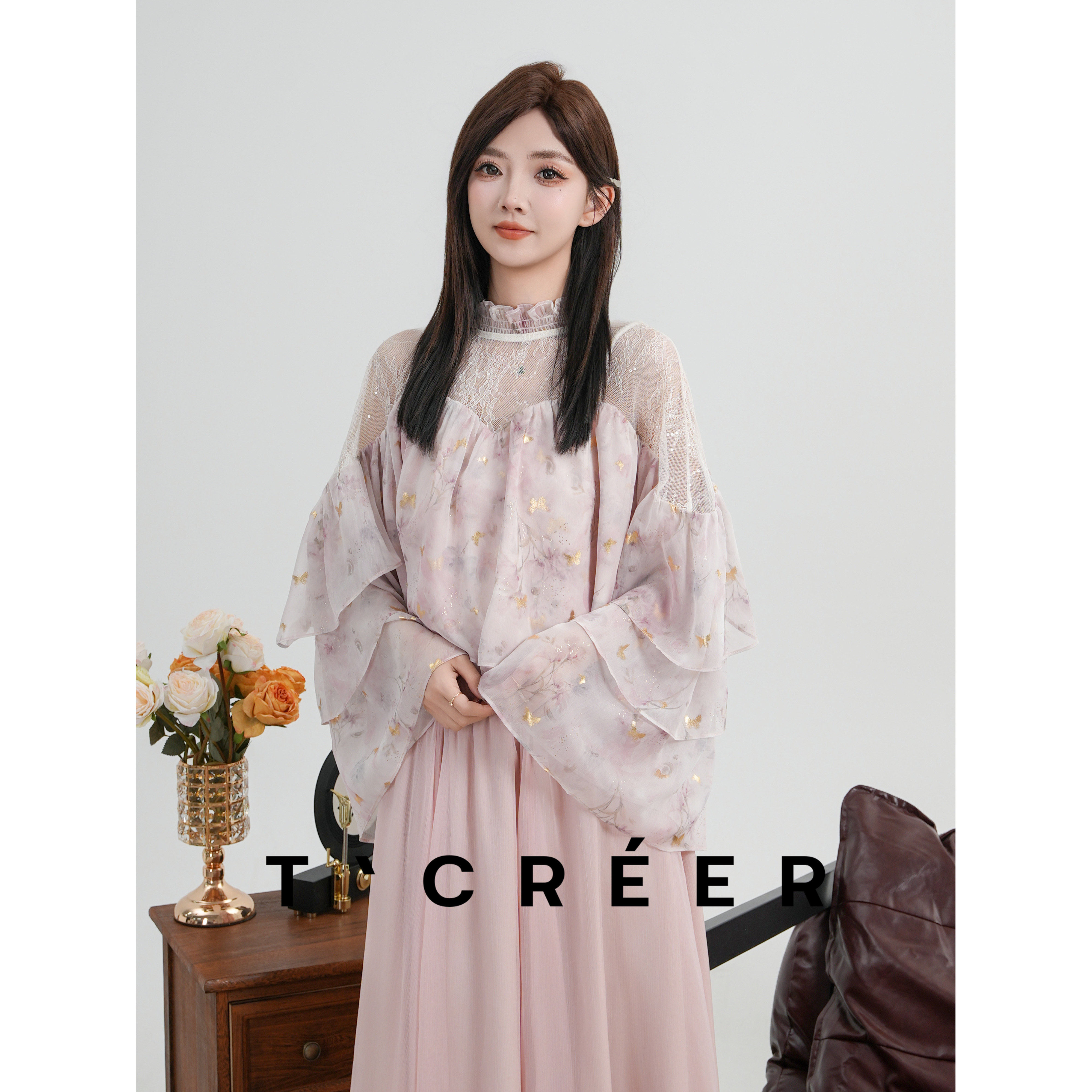 T`CREER| 蕾丝拼接晕染上衣女温柔风显瘦百搭 棠花春影