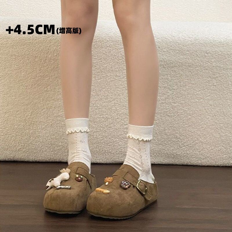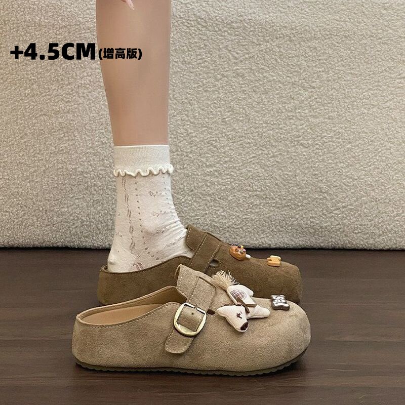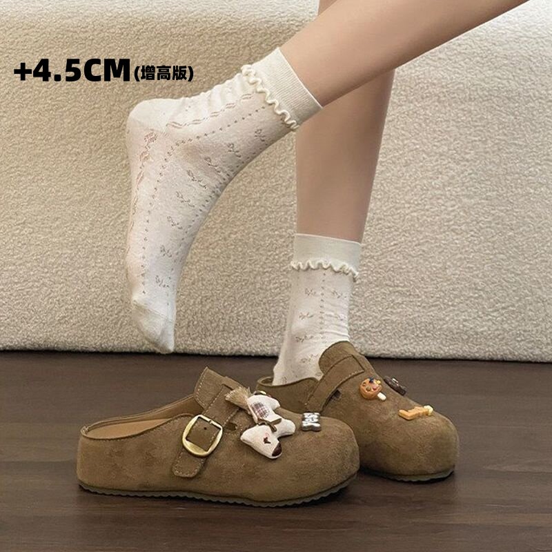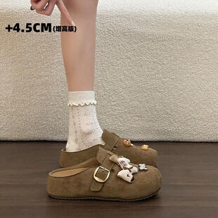 厚底一脚蹬外穿包头半拖鞋 女加绒冬季 内增高4.5cm勃肯鞋 卡通小马
