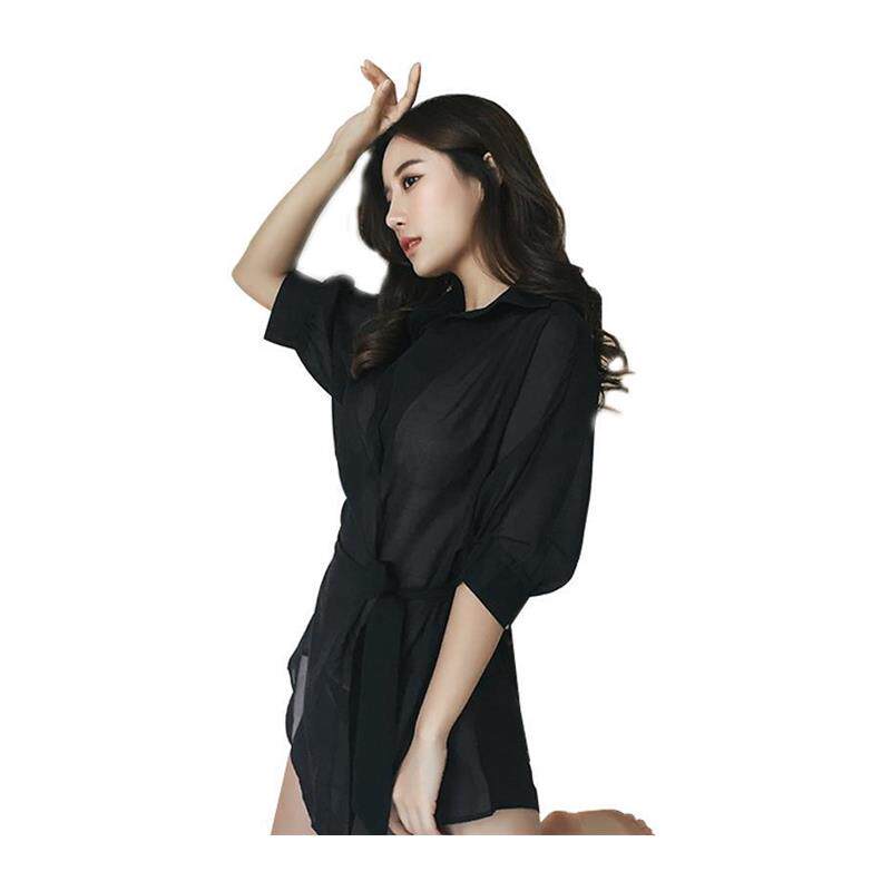 宽松性感透气睡衣长袖 长款 透视雪纺衬衣女睡裙 透明系带白衬衫 夏季
