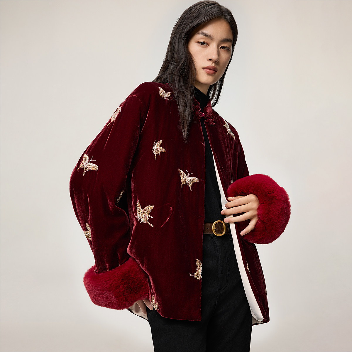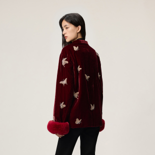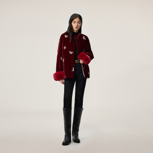 绣手工钉珠丝绒外套可拆袖 欧时力新中式 红色26春 奚梦瑶同款