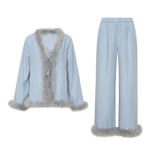 长裤 TOP家 复古慵懒感睡衣风仙气羽毛拼接系结开衫 法式 精致梦幻