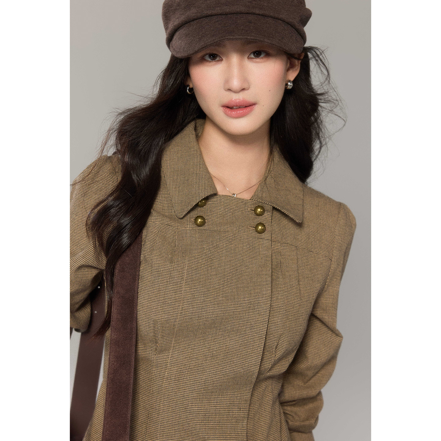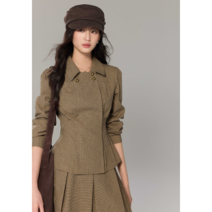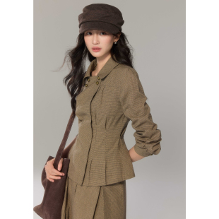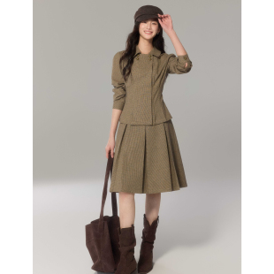 女双排扣上衣半裙通勤套装 复古彼得潘领格纹衬衫 嘉宜 贰羊设计