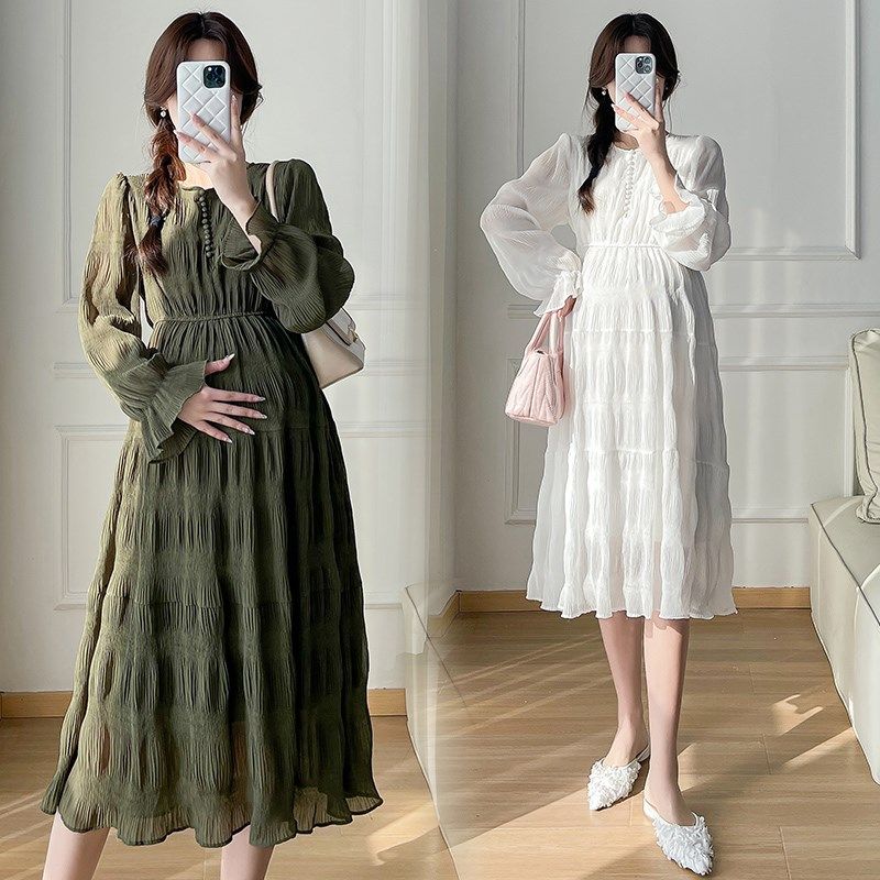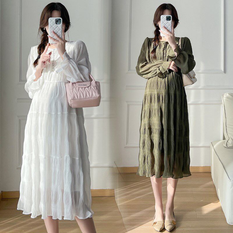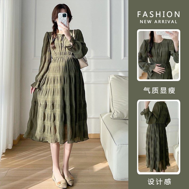 孕妇裙秋季 孕妇装 连衣裙2024新款 设计感压褶雪纺长袖 怀孕裙子 秋装