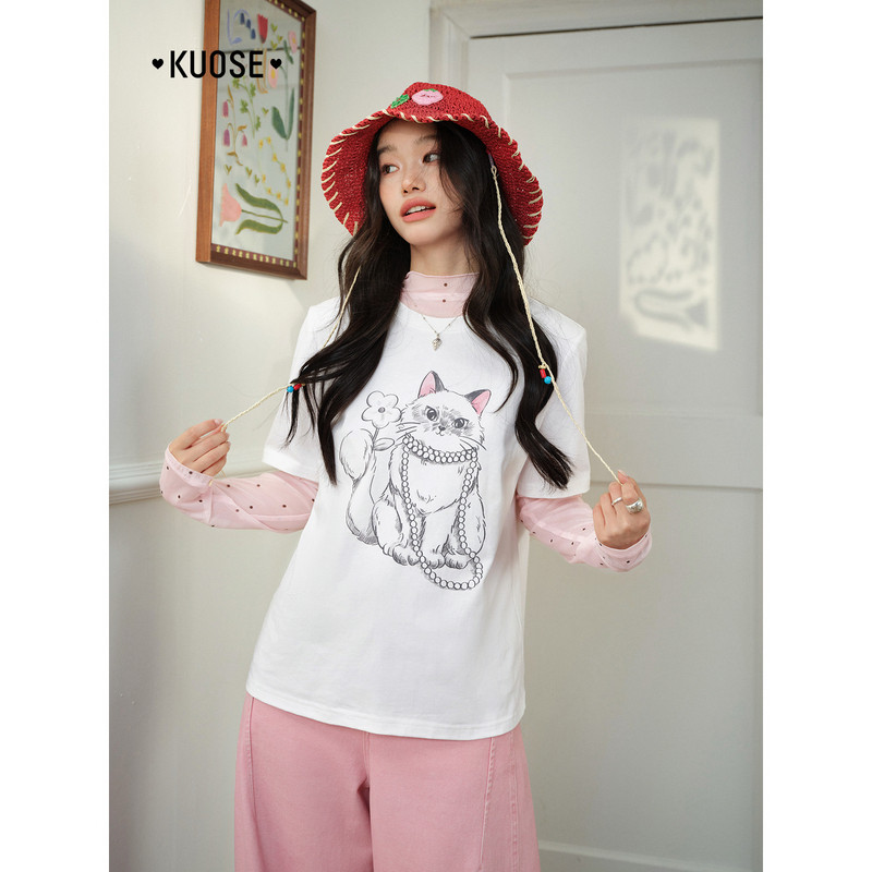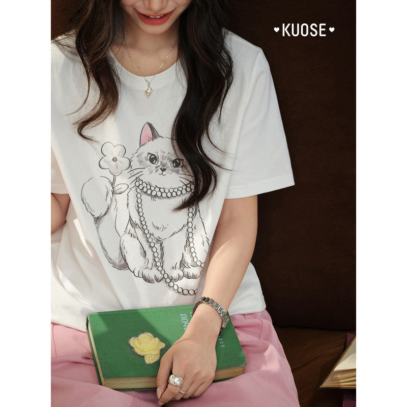 t恤夏 休闲圆领短袖 阔色正肩可爱小猫印花白色上衣女2026春季 新款