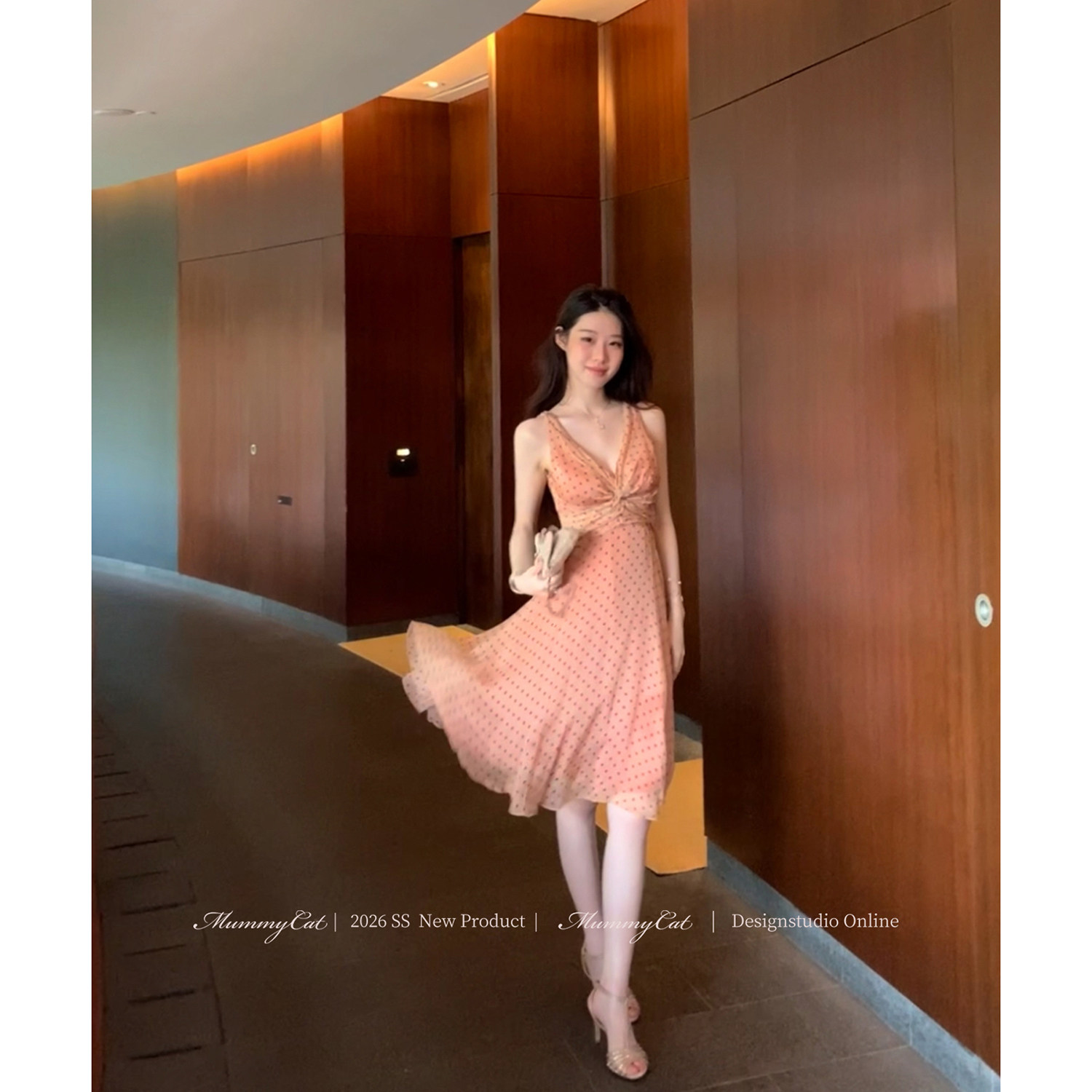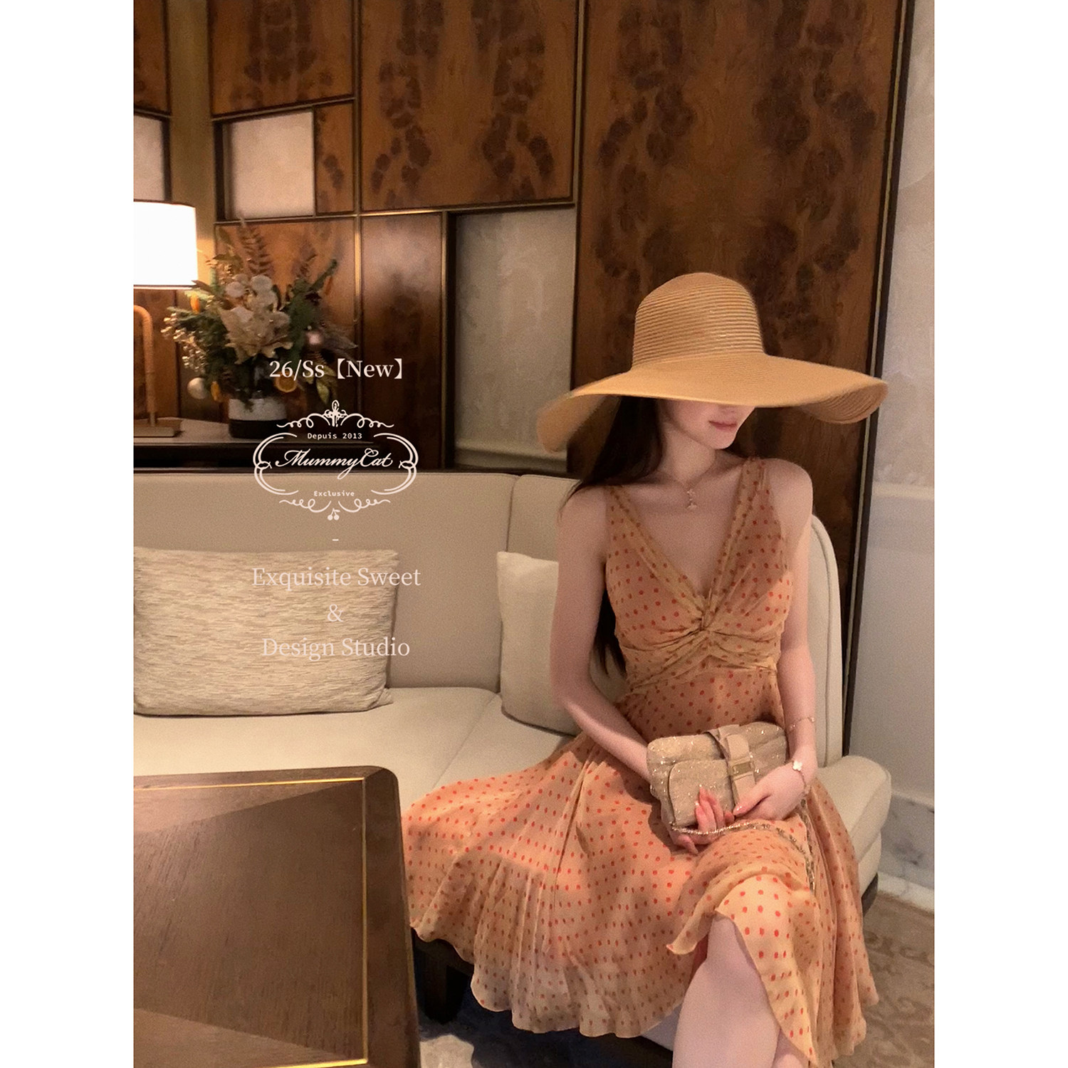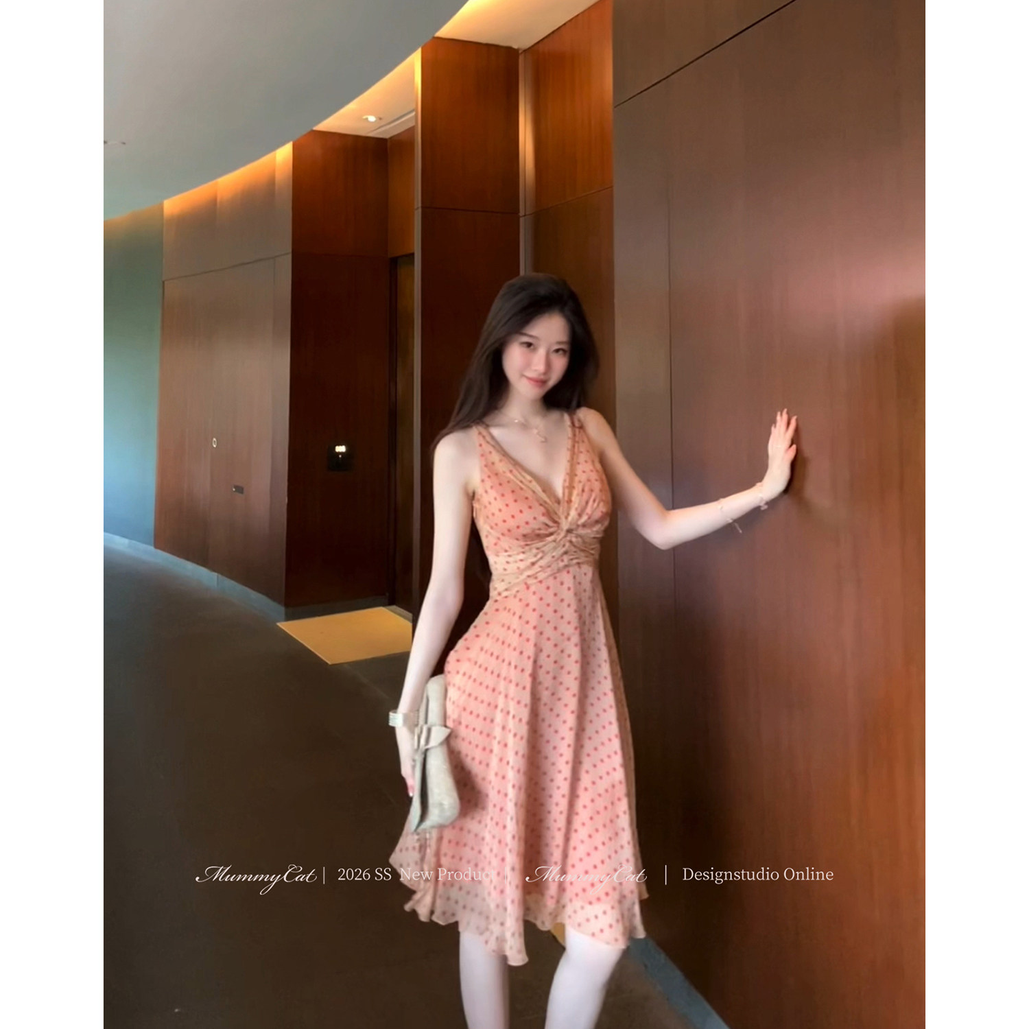 新品 Mummy 温香软玉 下蛋喵 桑蚕丝人丝波点复古扭结连衣裙 Cat