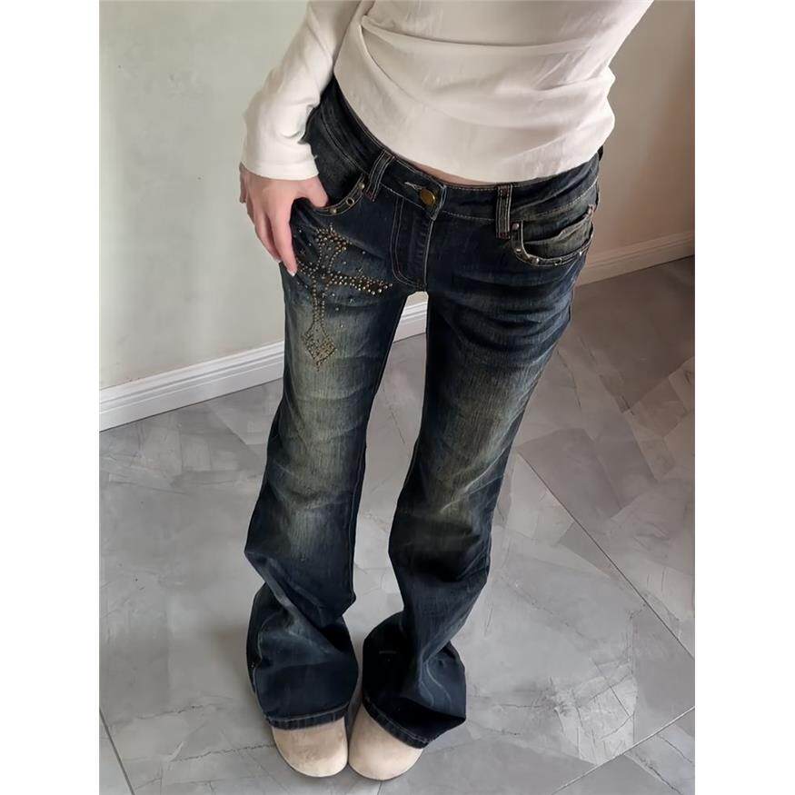 显瘦喇叭裤 美式 高街设计感修身 女春秋款 复古十字架烫钻微喇牛仔裤