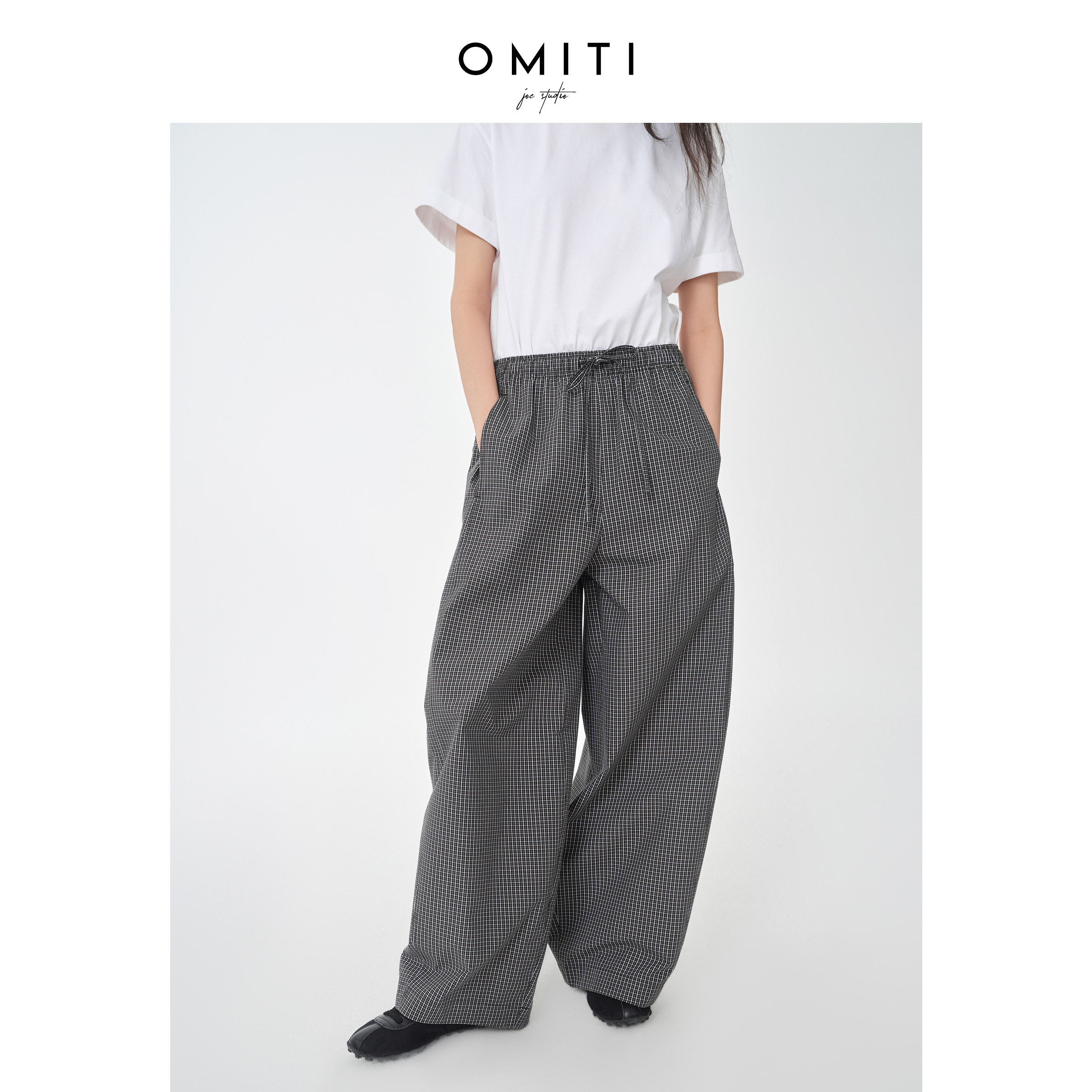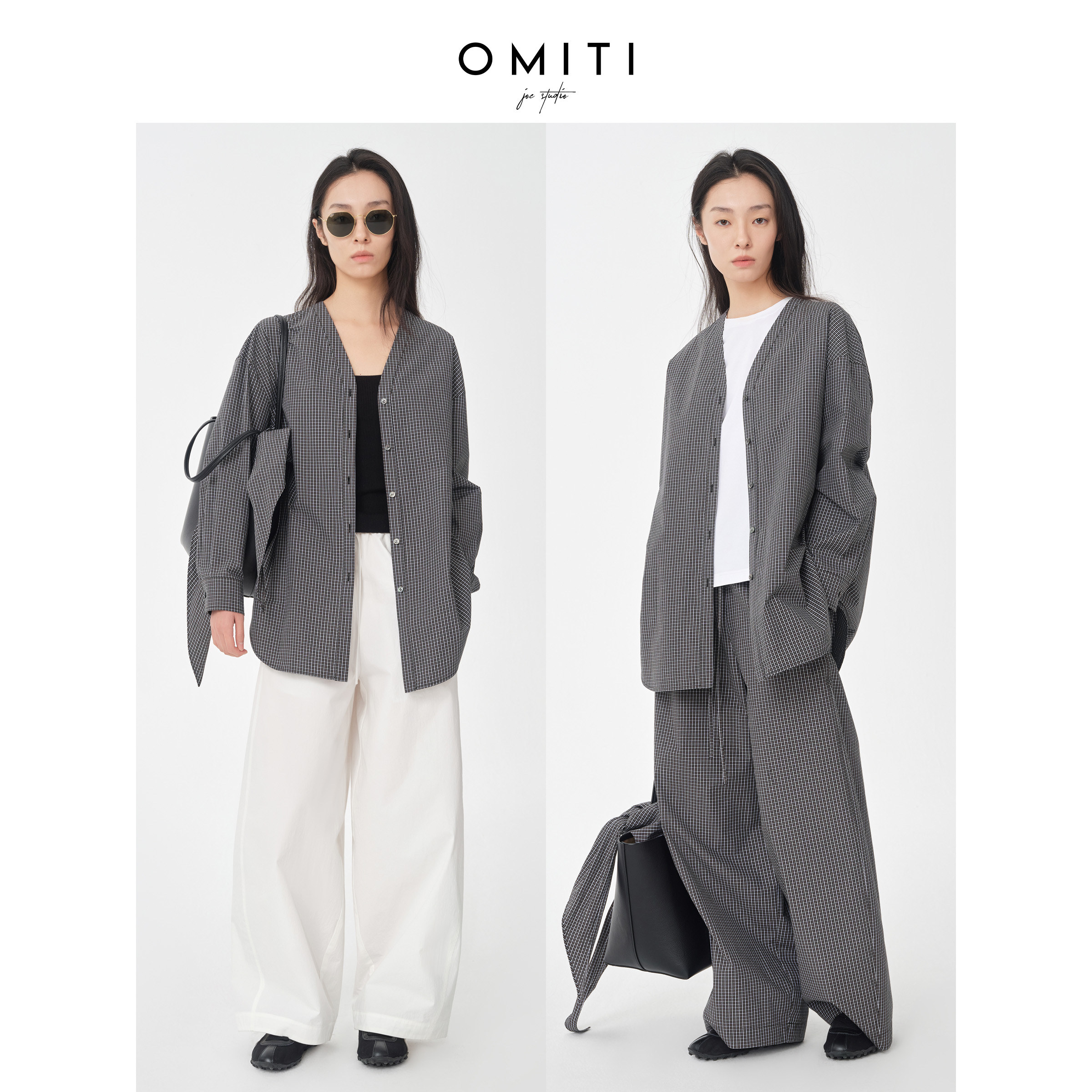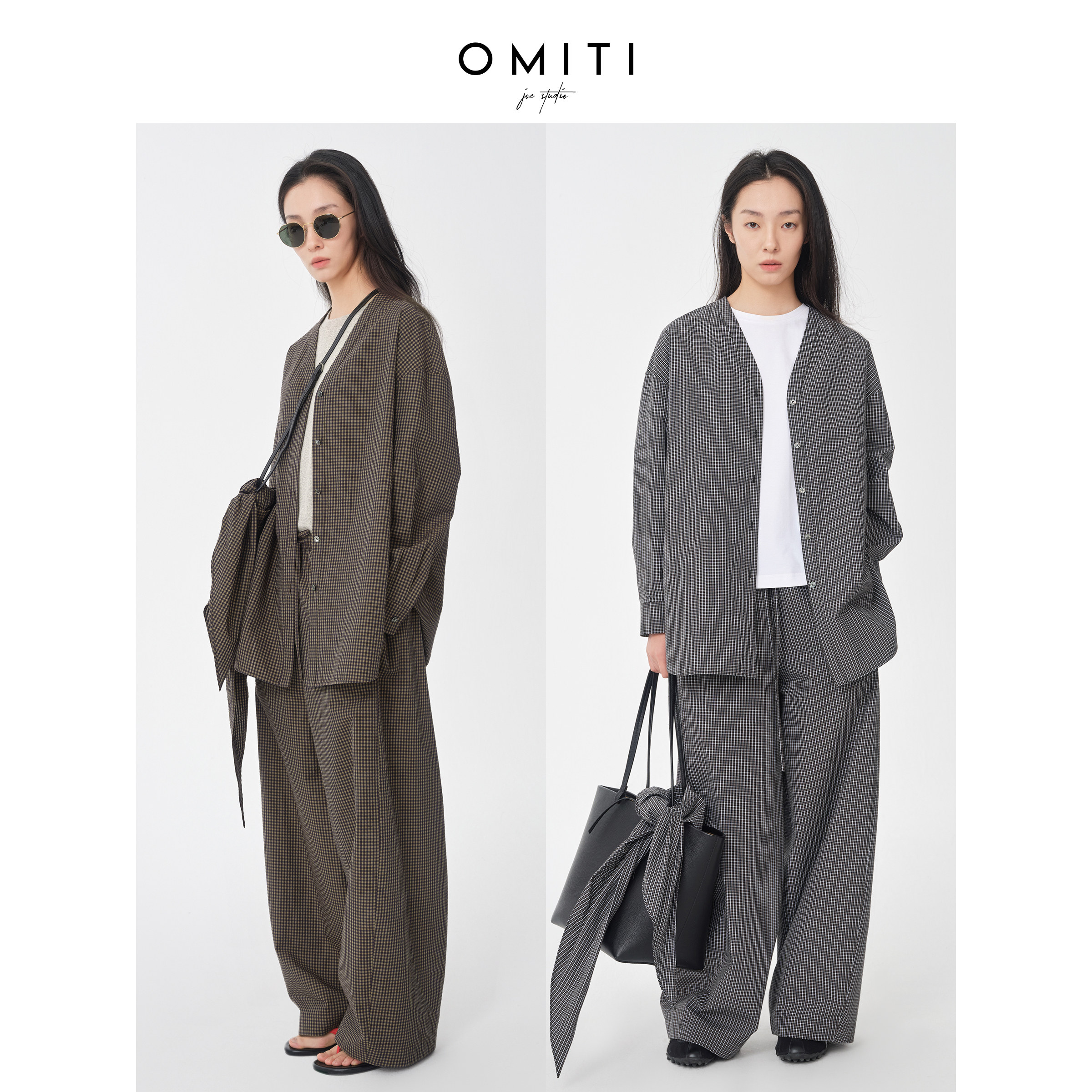 套装 女色织格纹休闲抽绳长裤 慵懒松弛感V领廓形衬衫 OMITI省略