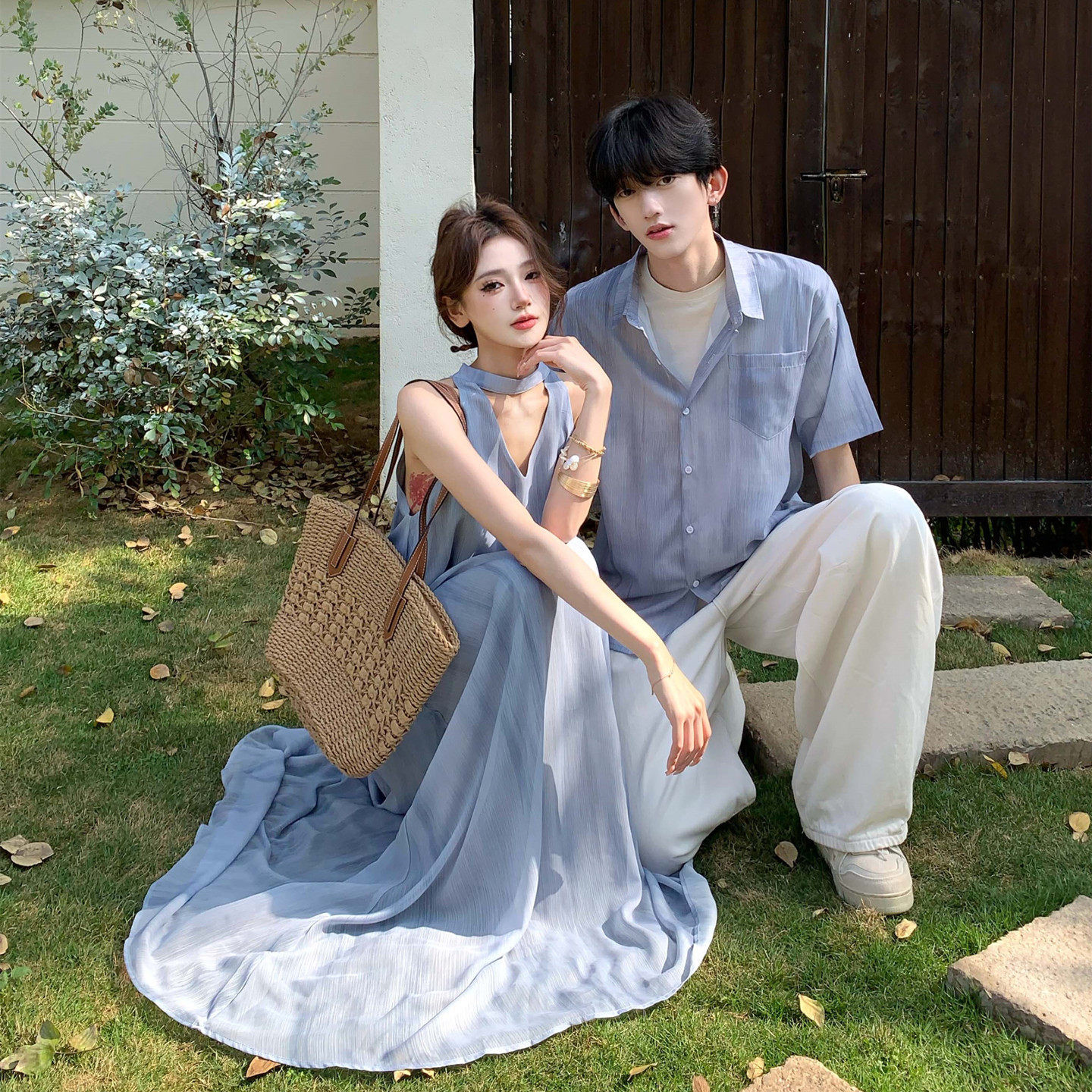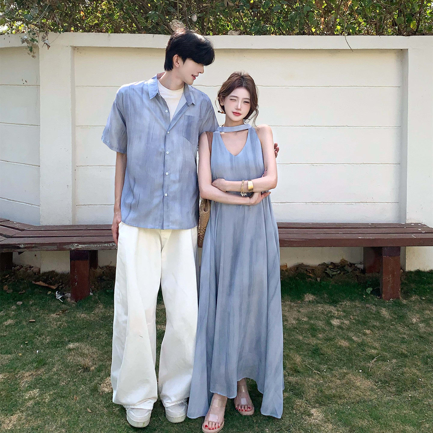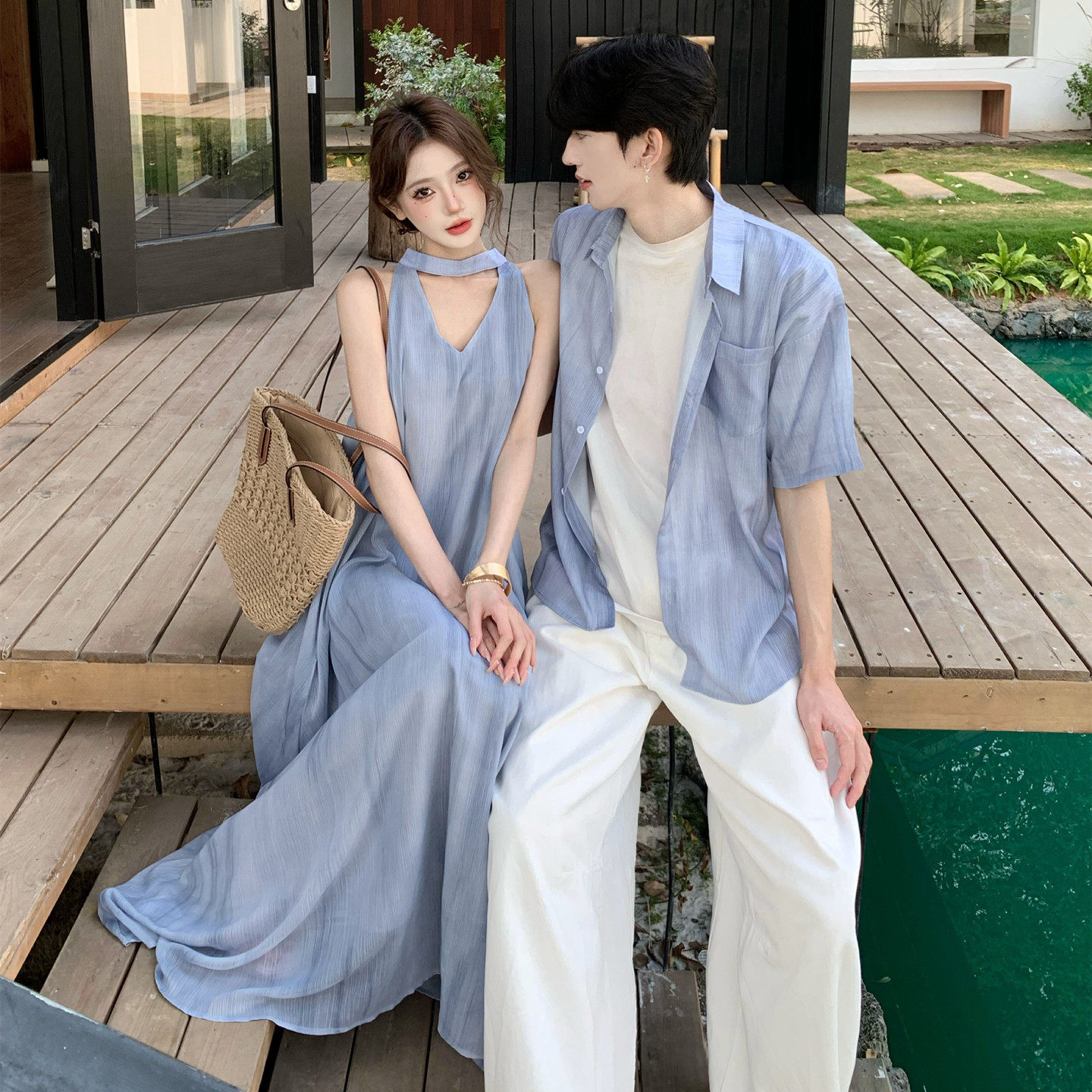 设计感渐变气质优雅连衣裙 法式 旅游度假风情侣装 一裙一衣2026新款