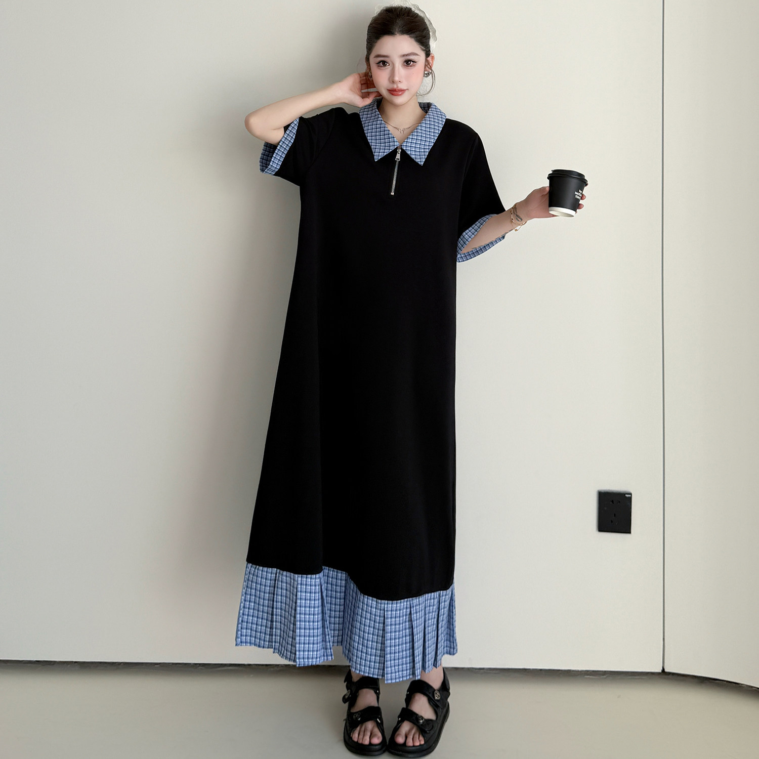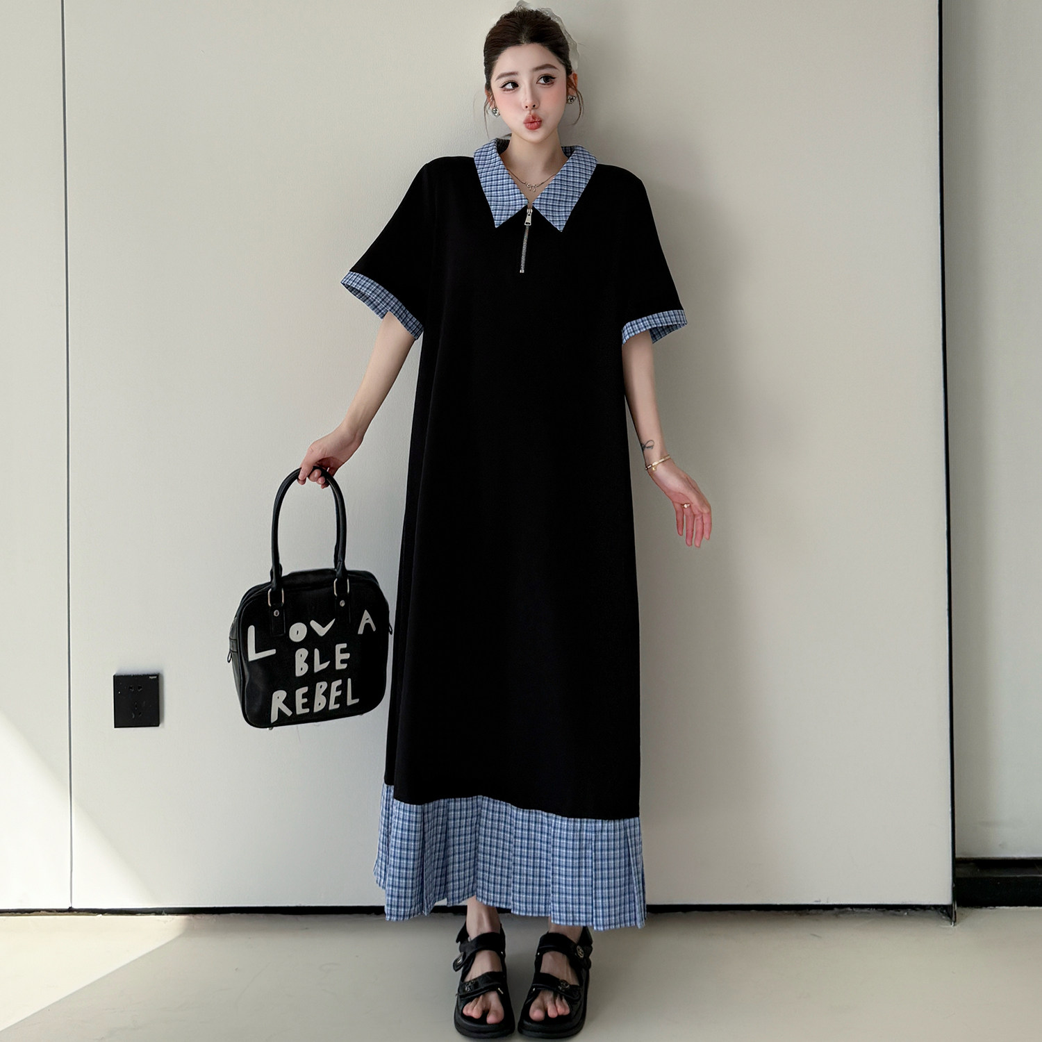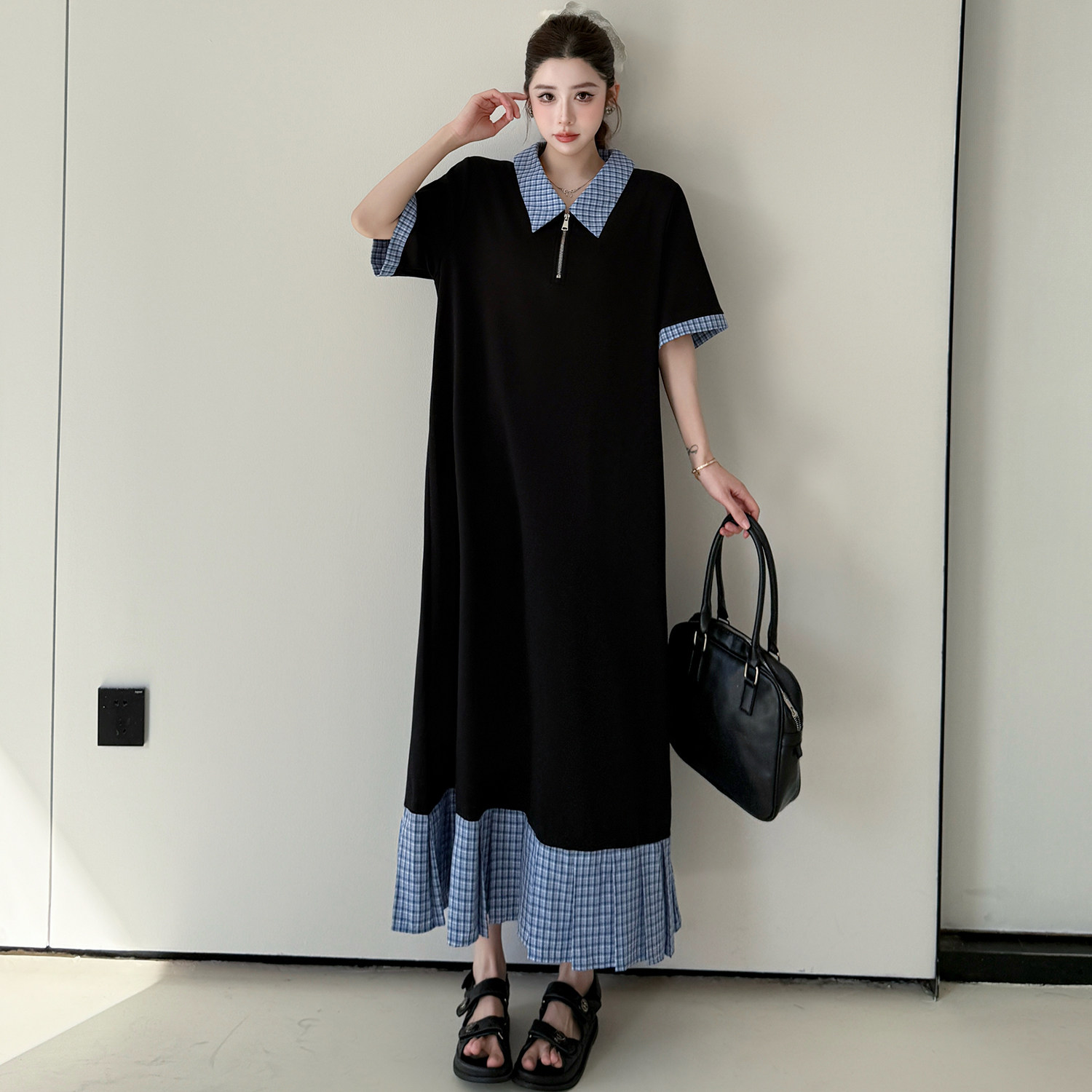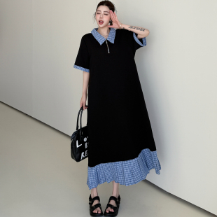 宽松显瘦荷叶边休闲Polo领裙子 连衣裙女大码 懒人长款 拼接格子短袖