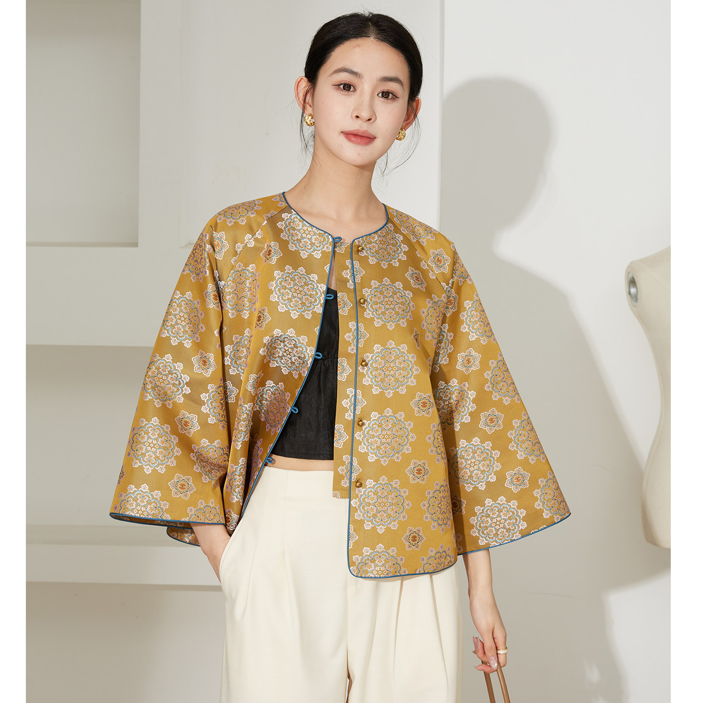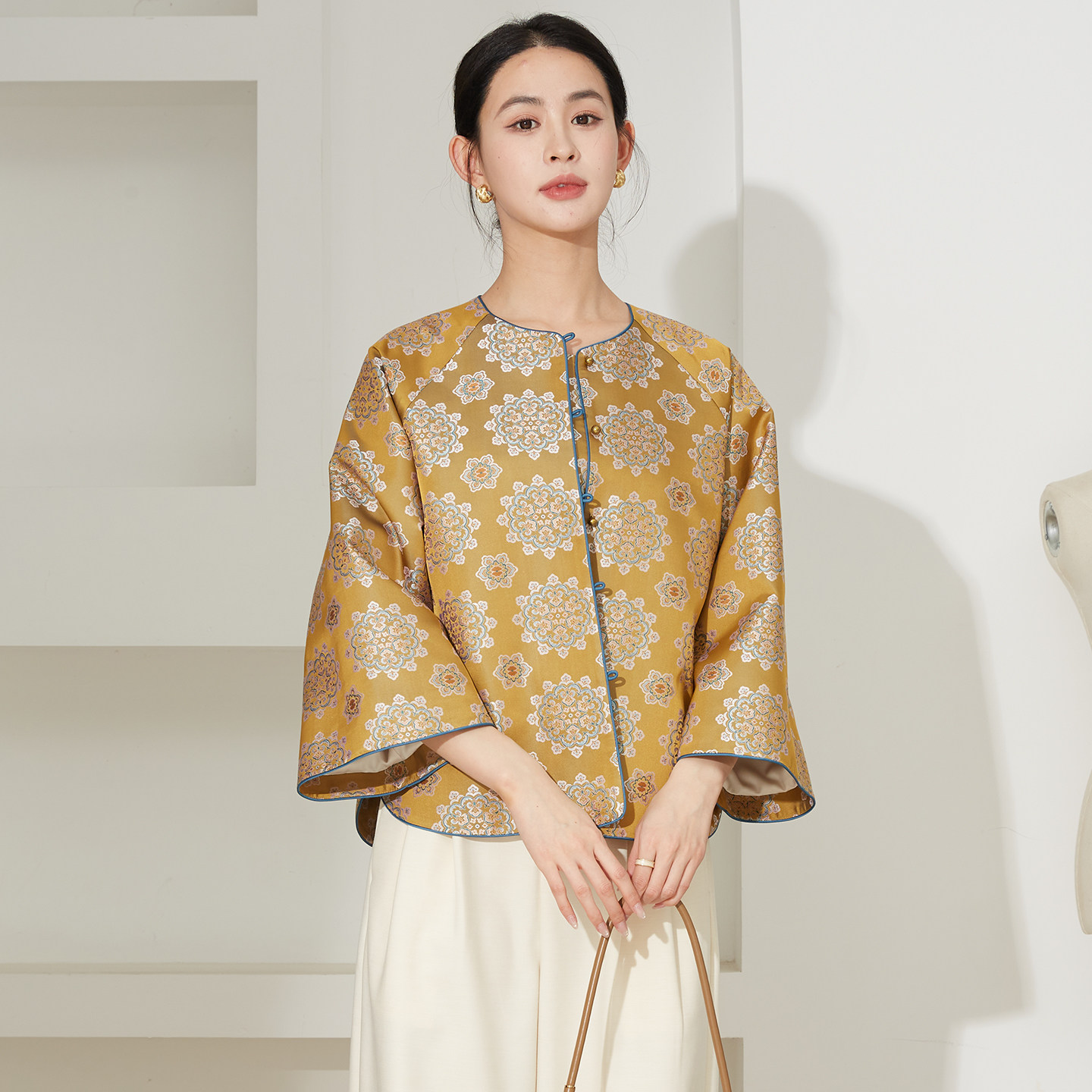 SILVIYE溯也 外套女上衣春 100%桑蚕丝国风宝相花宋锦提花真丝开衫