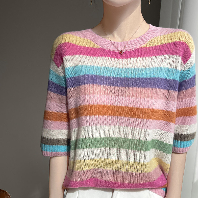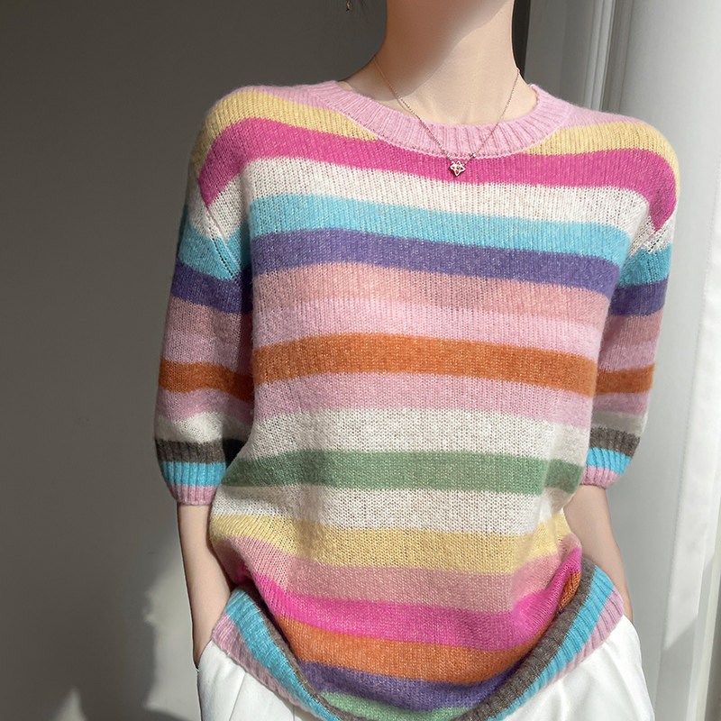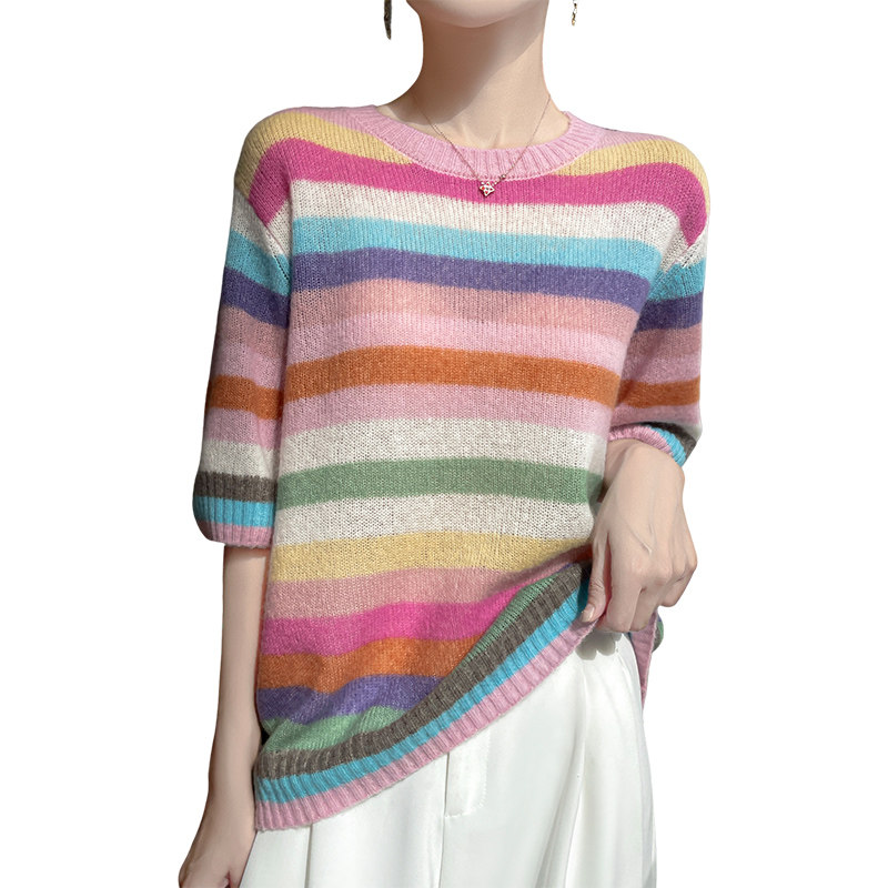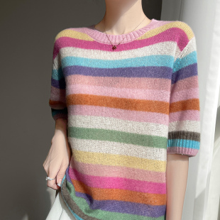 针织五分袖 蓬松软糯75%山羊绒25%桑蚕丝彩虹条女圆领短袖 宽松薄款