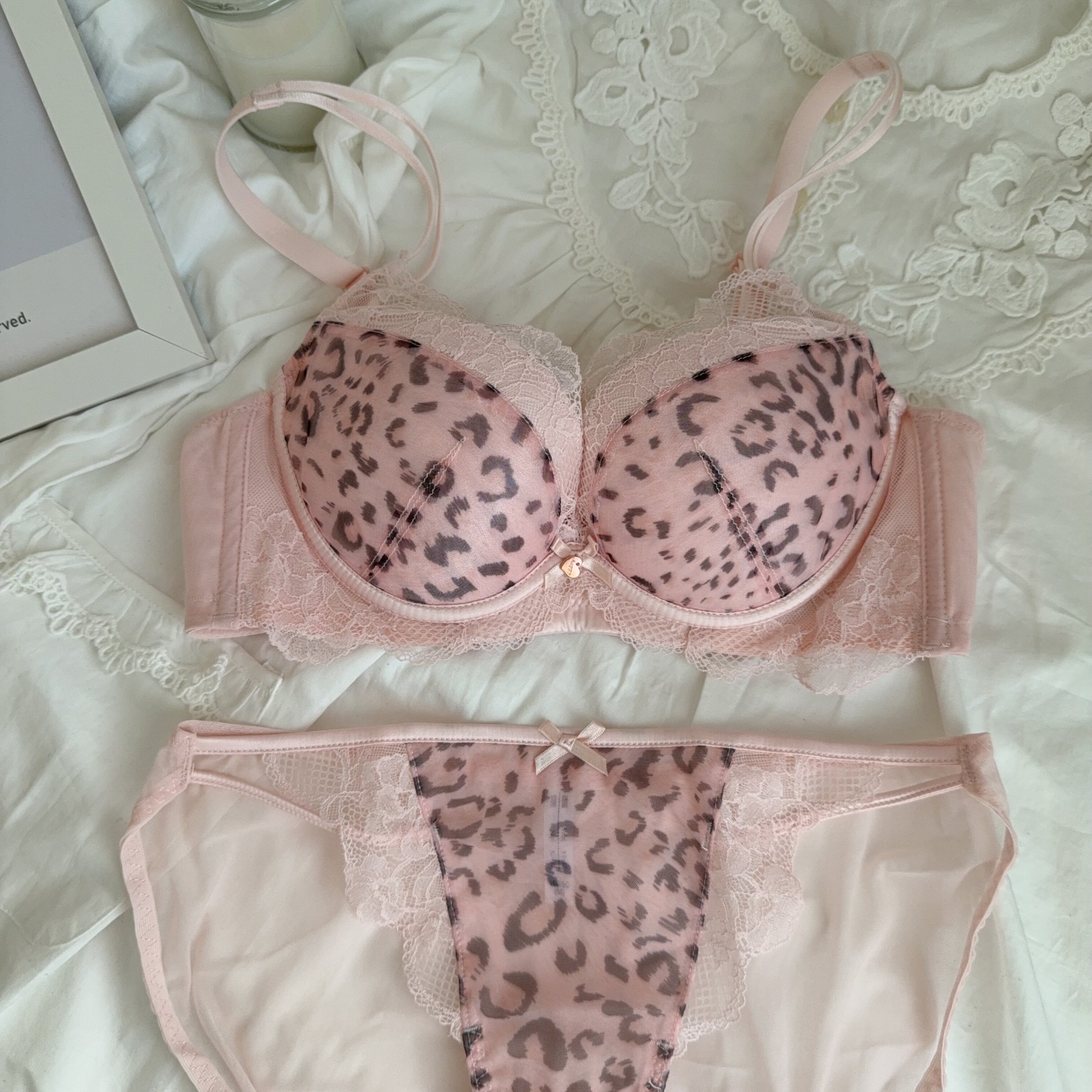 性感豹纹内衣女聚拢文胸套装 蕾丝无钢圈调整型防下垂莫代尔 法式