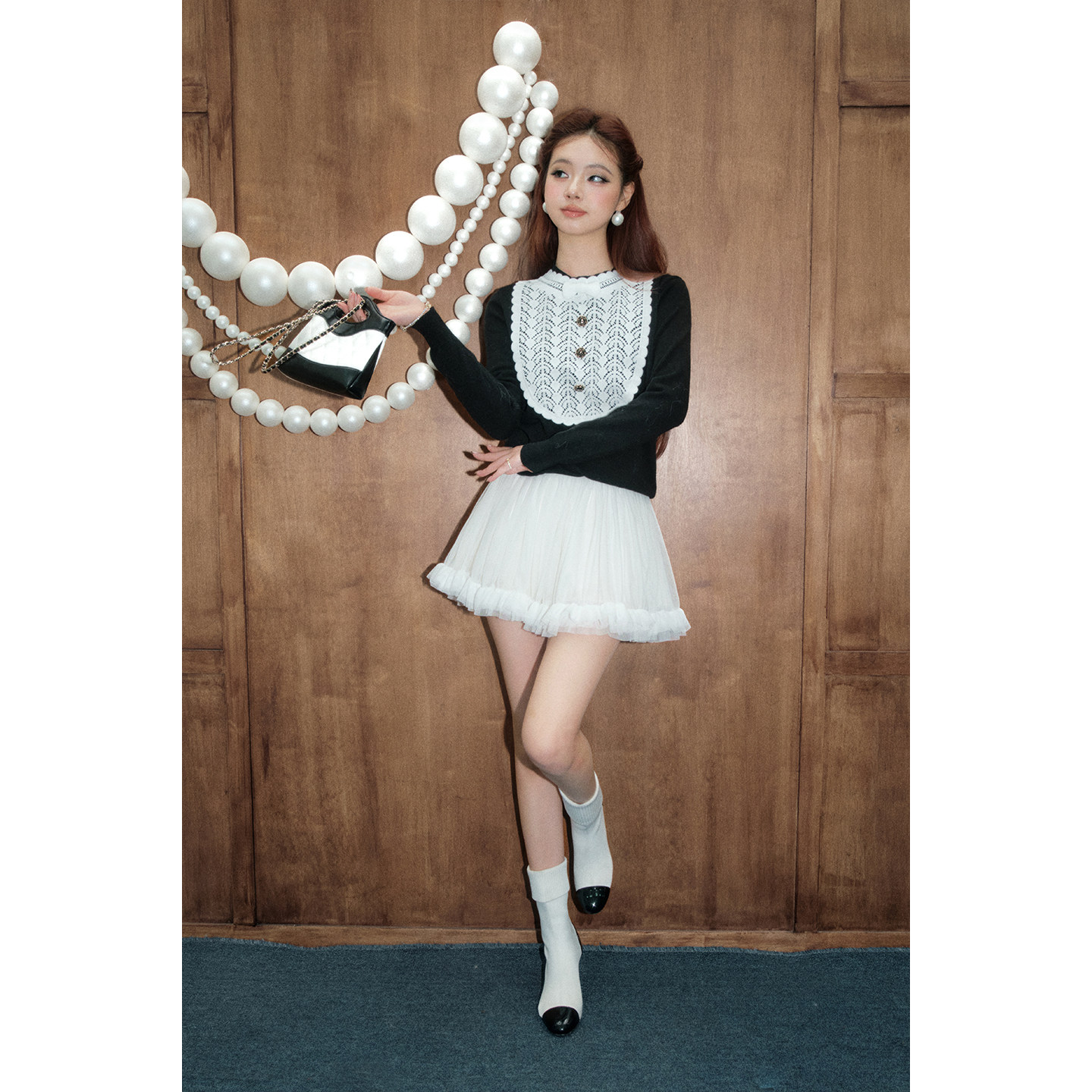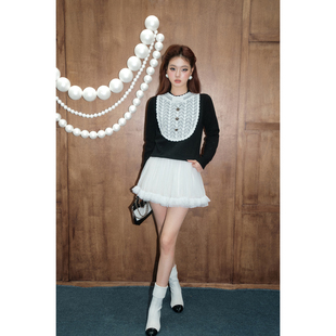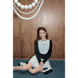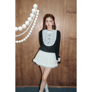 上衣独特超好看黑色衬衣 独特别致新款 韩系复古蕾丝花边衬衫 女冬季