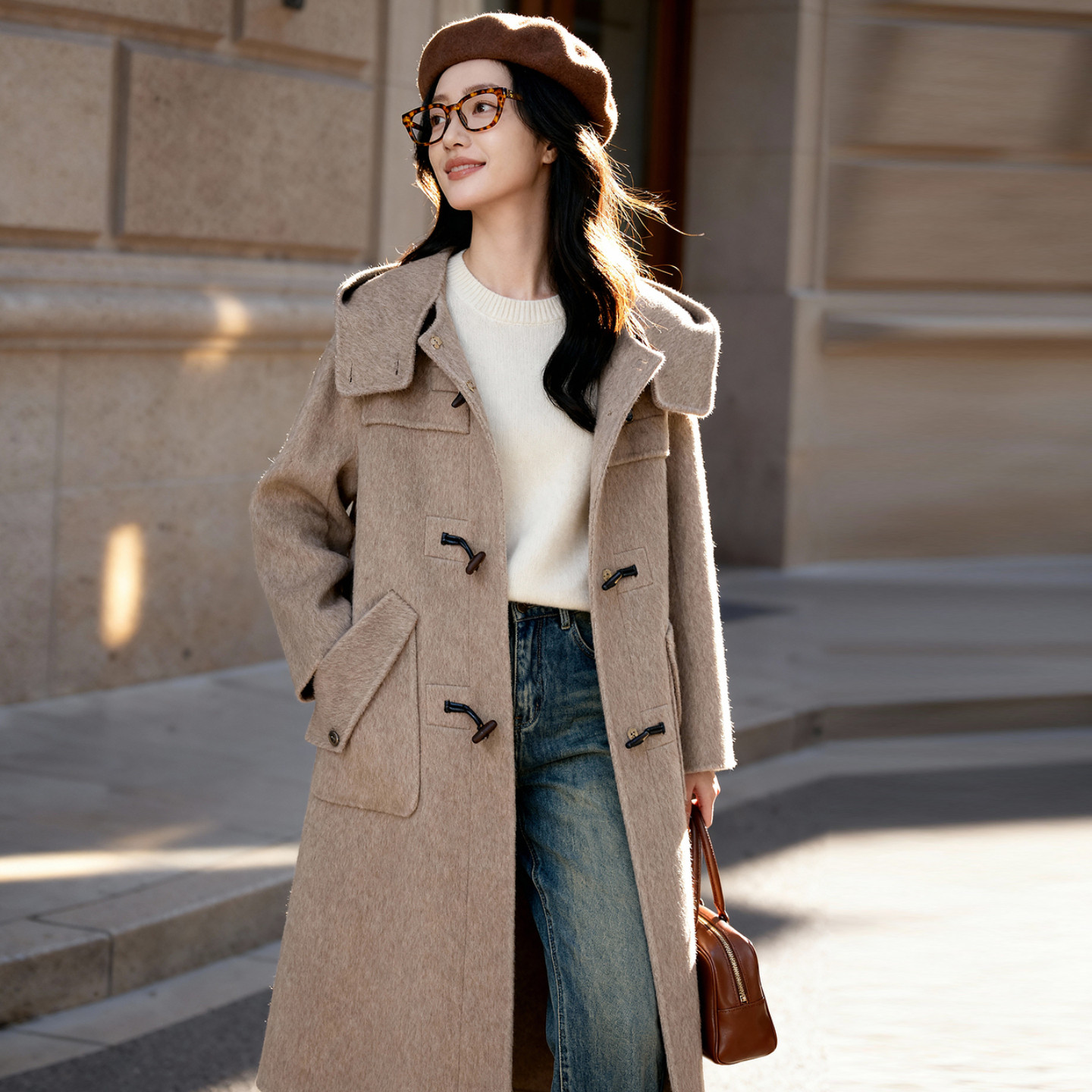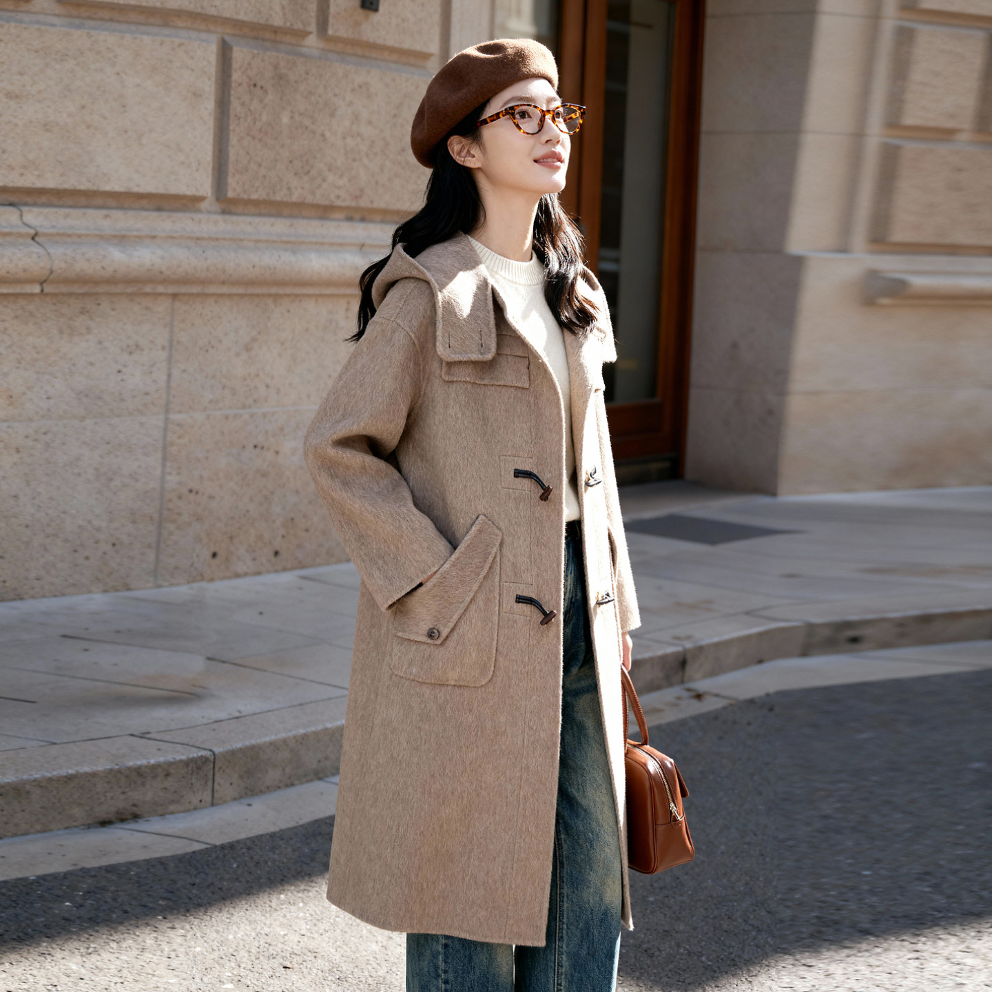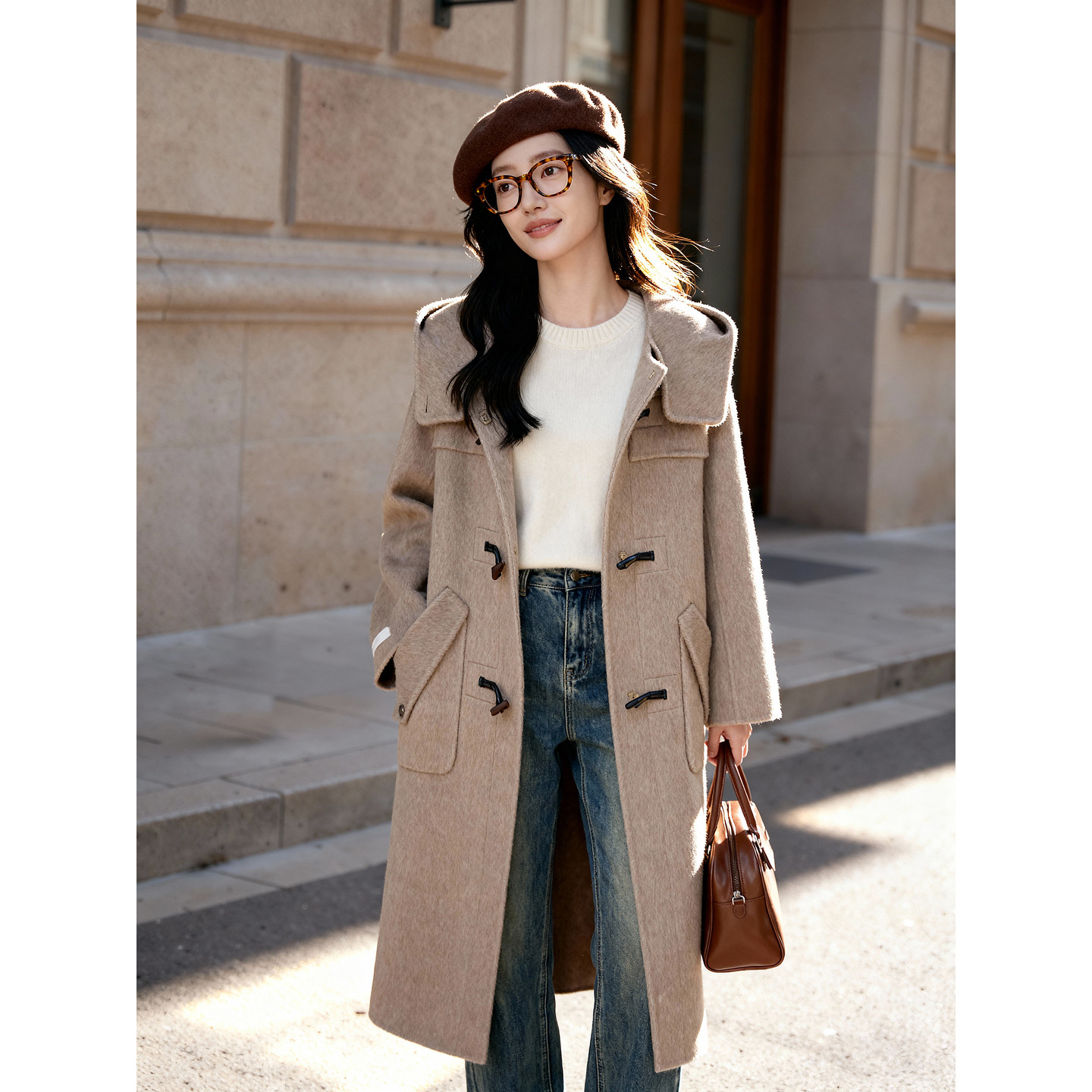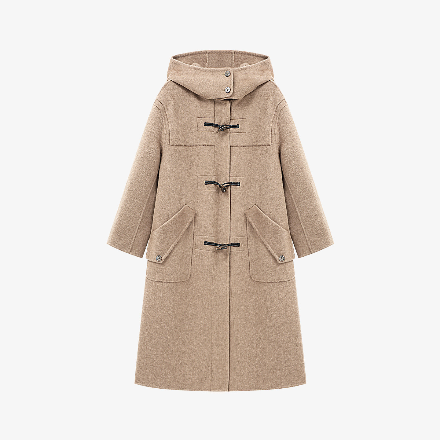 气质外套 燕麦色立领长款 百家好牛角扣双面毛呢连帽大衣女冬季 新款