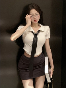 辣妹性感弹力上衣包臀裙套装 纯欲风修身 女短袖 白衬衫 OL制服夏 短款