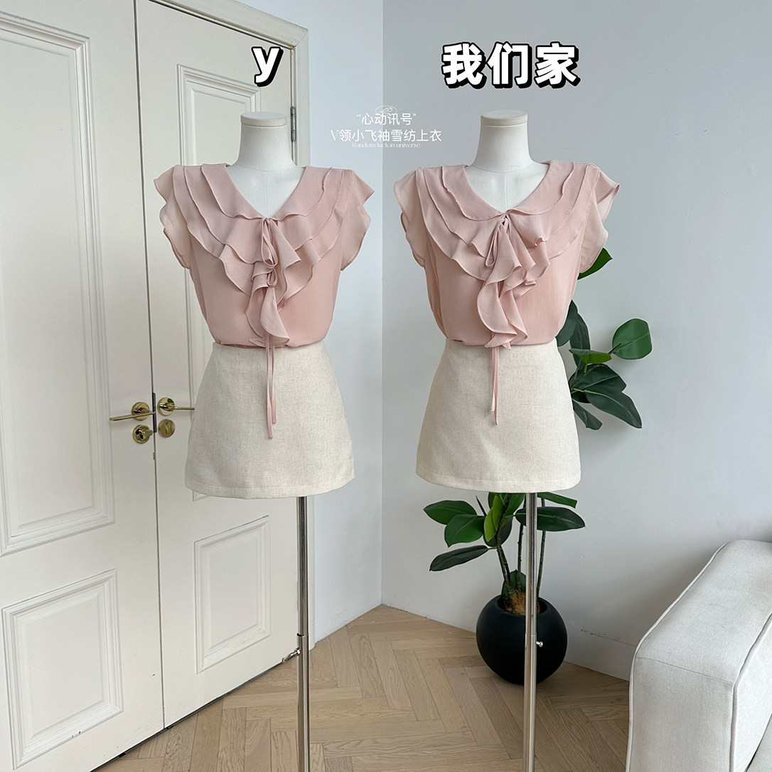 雪纺上衣宽松气质女人风 粉色花边V领小飞袖 柒月末 心动讯号