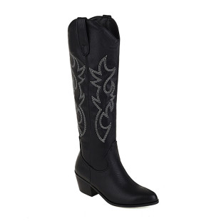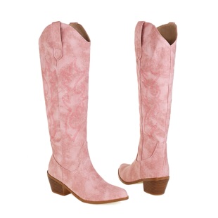 粉色高筒靴白色时装 靴子民族风刺绣骑士靴粗中跟高筒靴大码