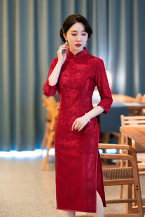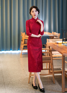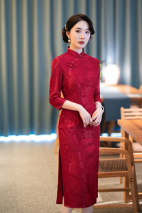 她来了复古馆暗花纹酒红色年会结婚过年旗袍中国风气质修身 连衣裙
