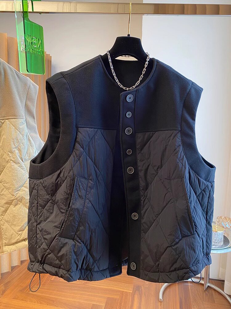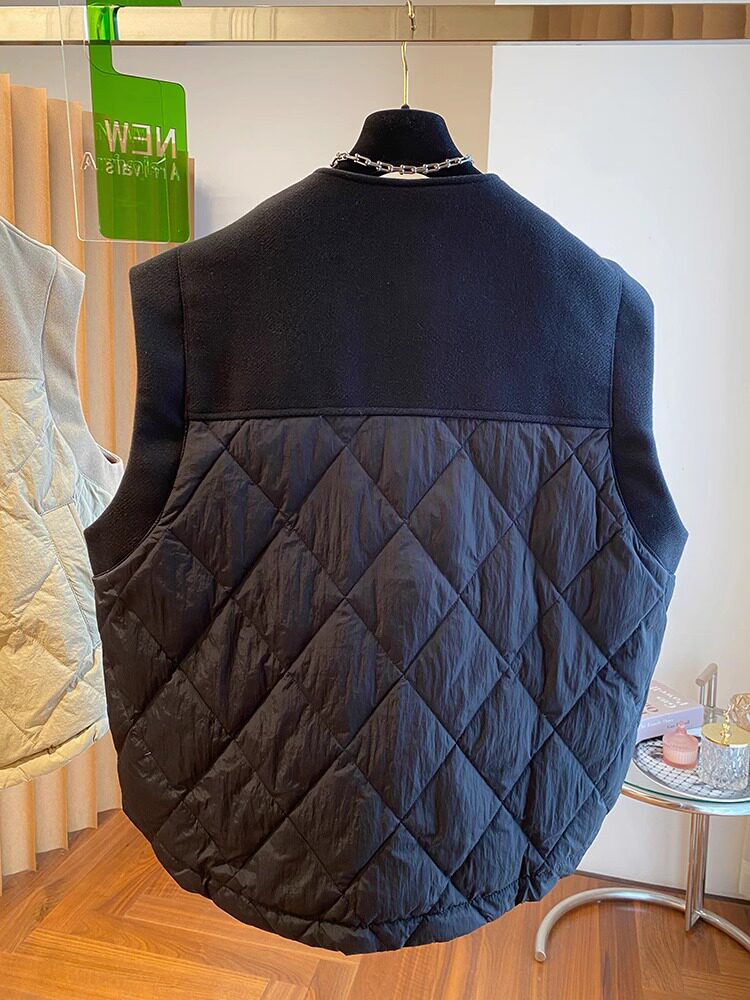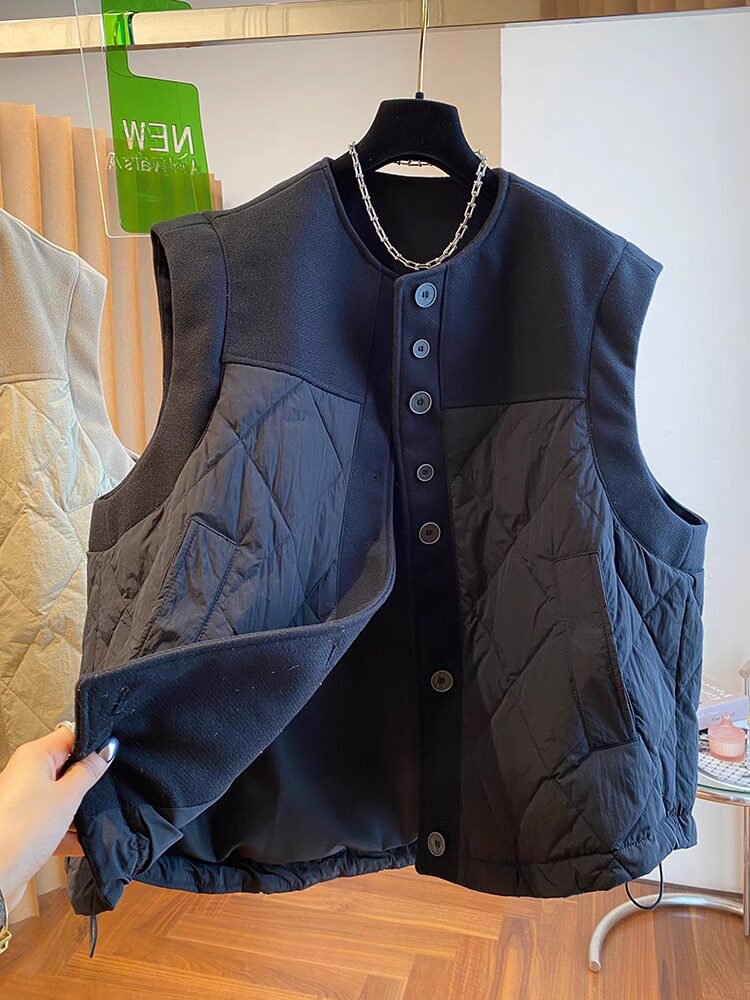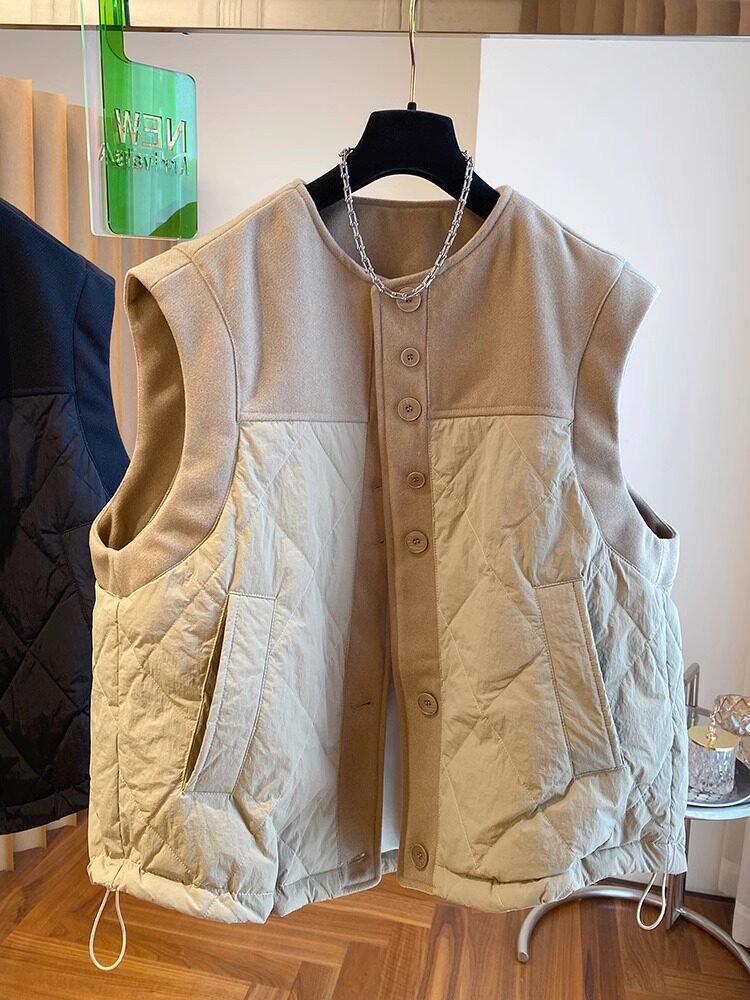 马夹外套 无袖 2023新款 欧货设计感宽松毛呢拼接卡其棉服上衣女冬季