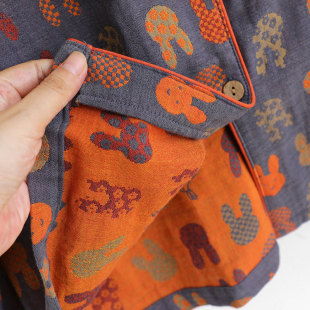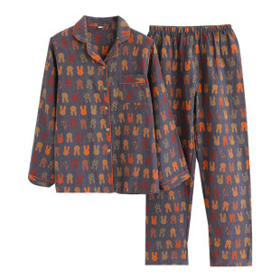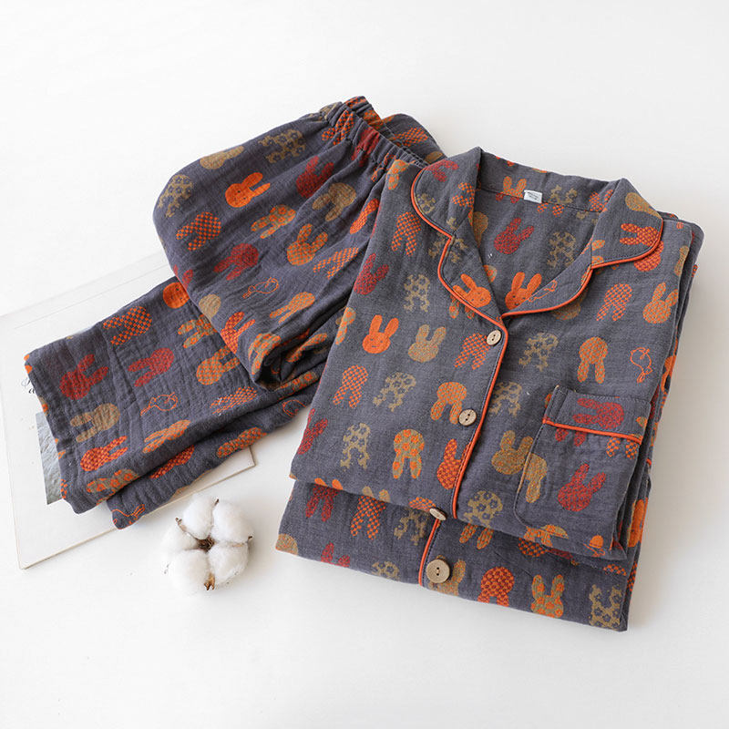 家居服套装 男士 翻领 长袖 色织复古小兔情侣睡衣女纯棉纱布春秋薄款