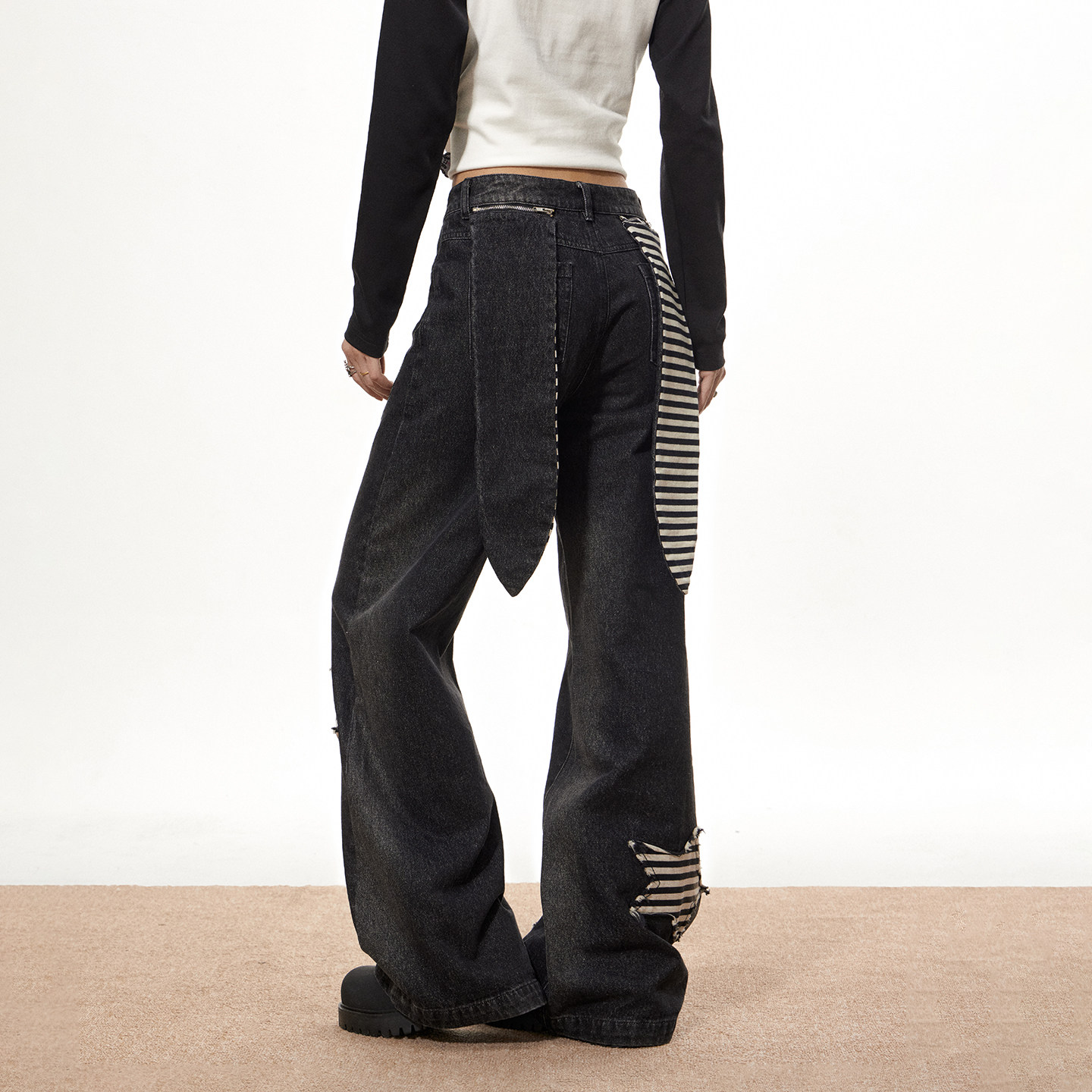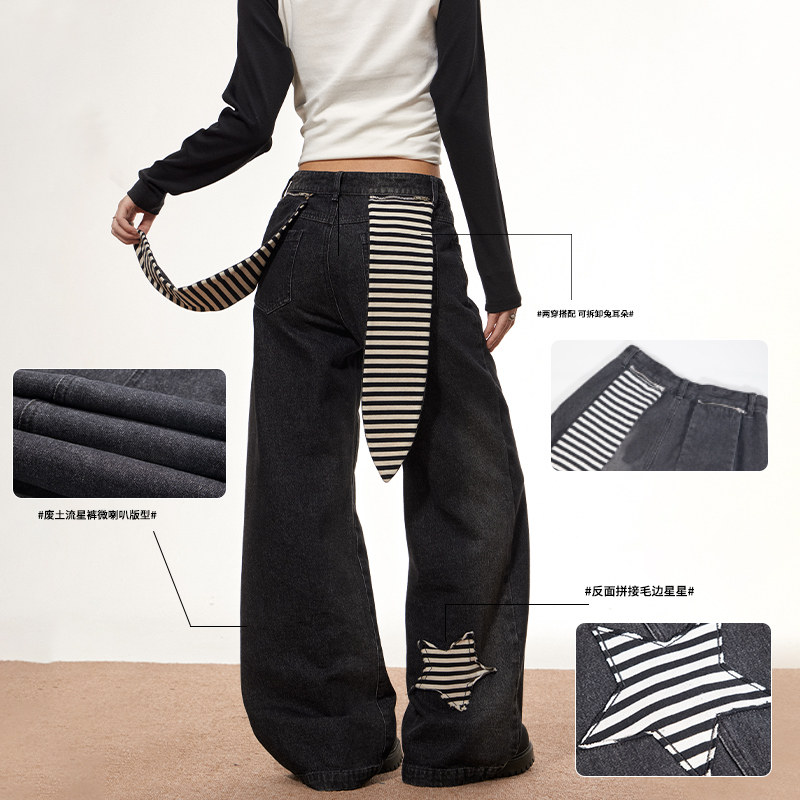 女直筒宽松设计感微喇阔腿裤 梁拌泡菜美式 复古星星兔子高腰牛仔裤
