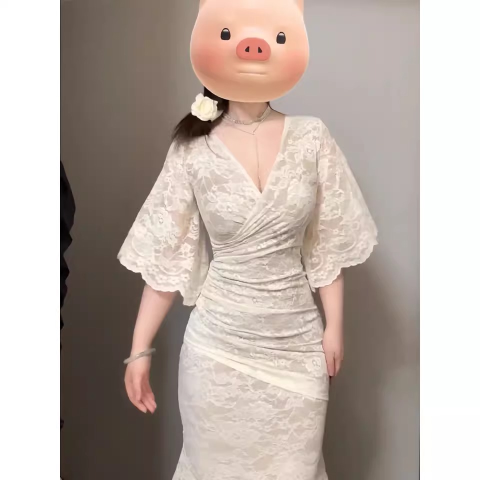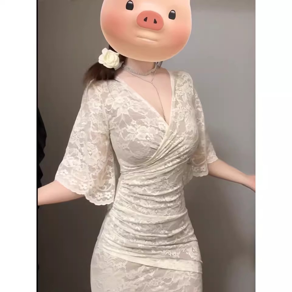 300斤新款 连衣裙显瘦收腰纯欲设计感包臀短裙女 蕾丝拼接V领特大码