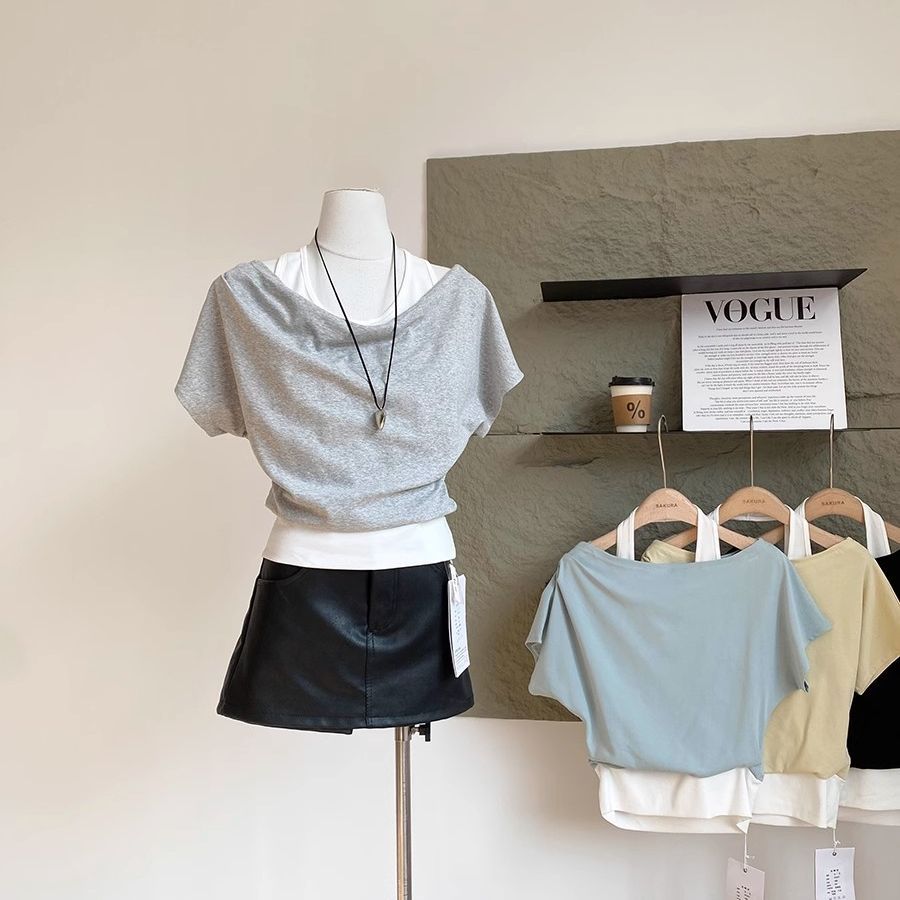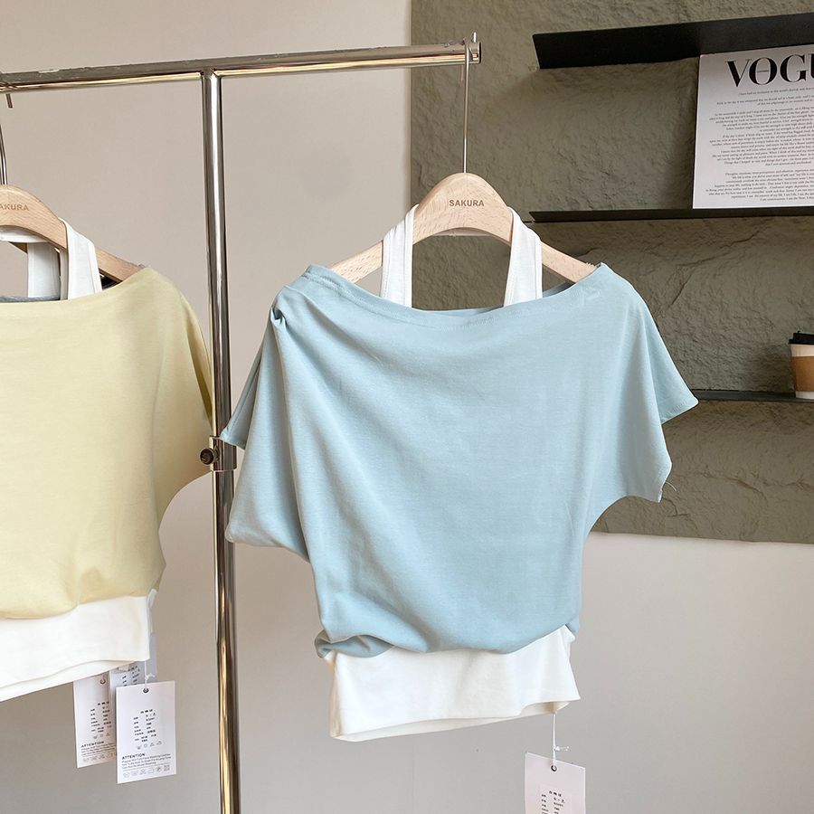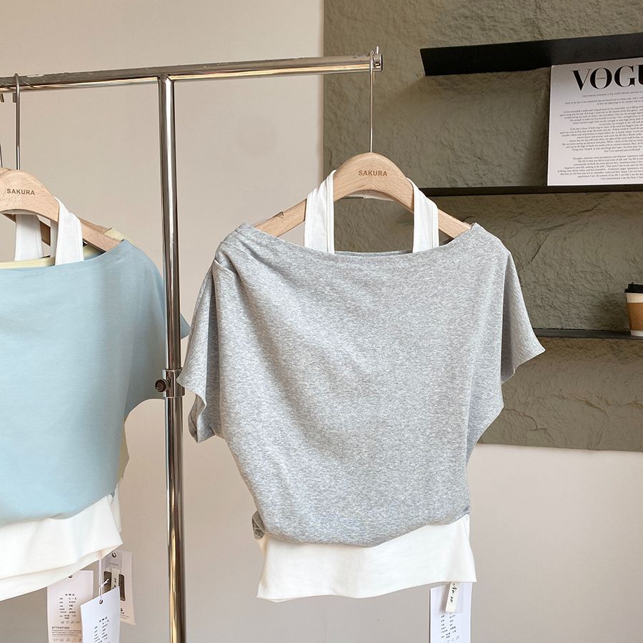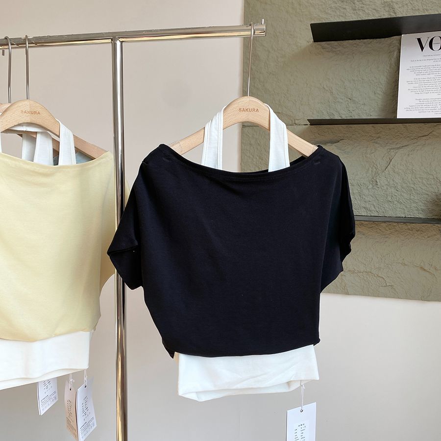 百搭纯色简约挂脖一字肩露肩假两件上衣洋气半袖 韩版 女 新款 夏季