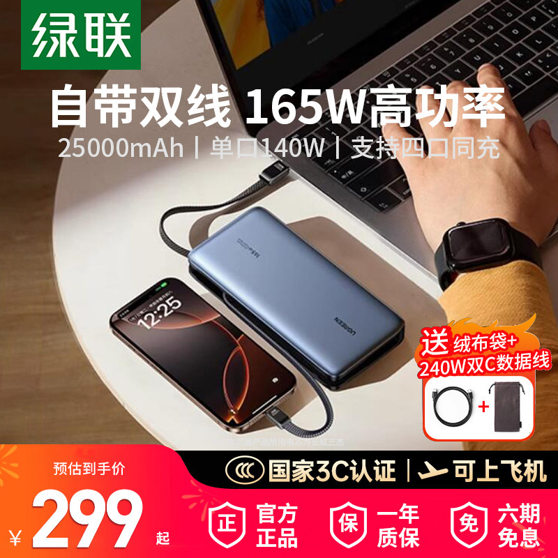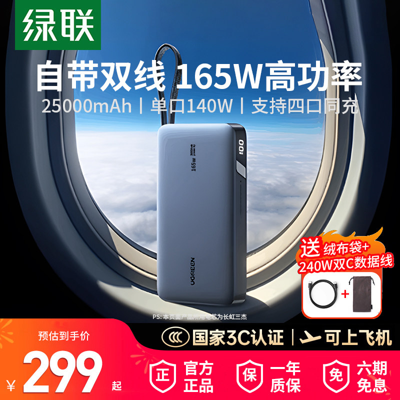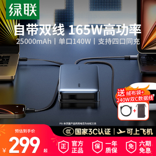 充电宝25000毫安165W笔记本电脑适用iPhone安卓手机大功率快充移动电源145W可上飞机高铁 绿联新款 3C认证