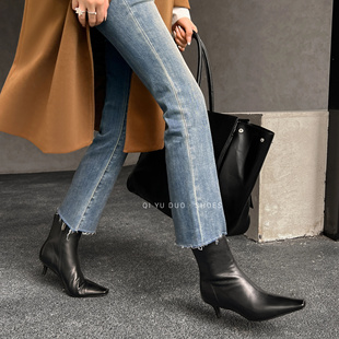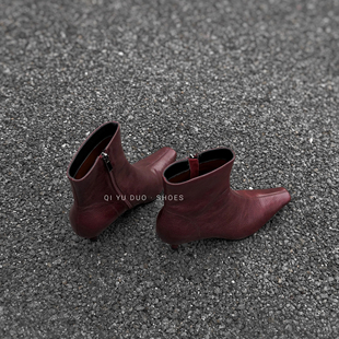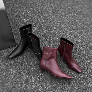 5cm极简百搭真皮短靴秋冬方头侧拉链单靴气质裸靴 羊皮 七与多