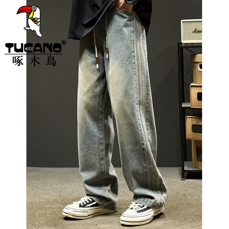 长裤 秋冬季 宽松潮牌纯棉阔腿条纹复古vibe工装 男美式 子 直筒牛仔裤