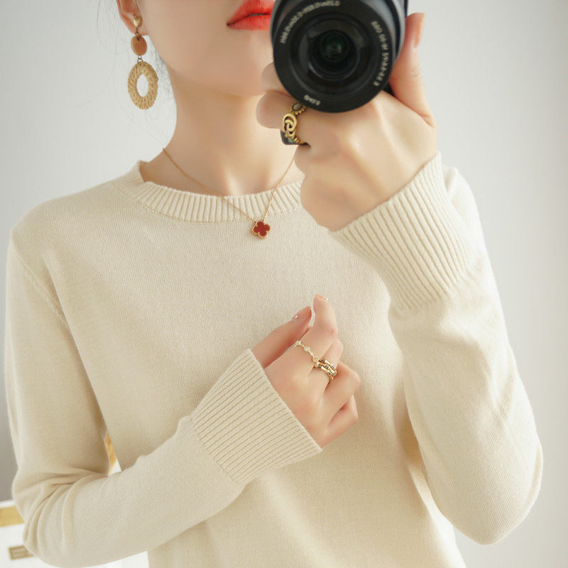上毛衣春秋季 薄款 宽松套头内百搭打底 女圆领纯色长袖 全棉线针织衫